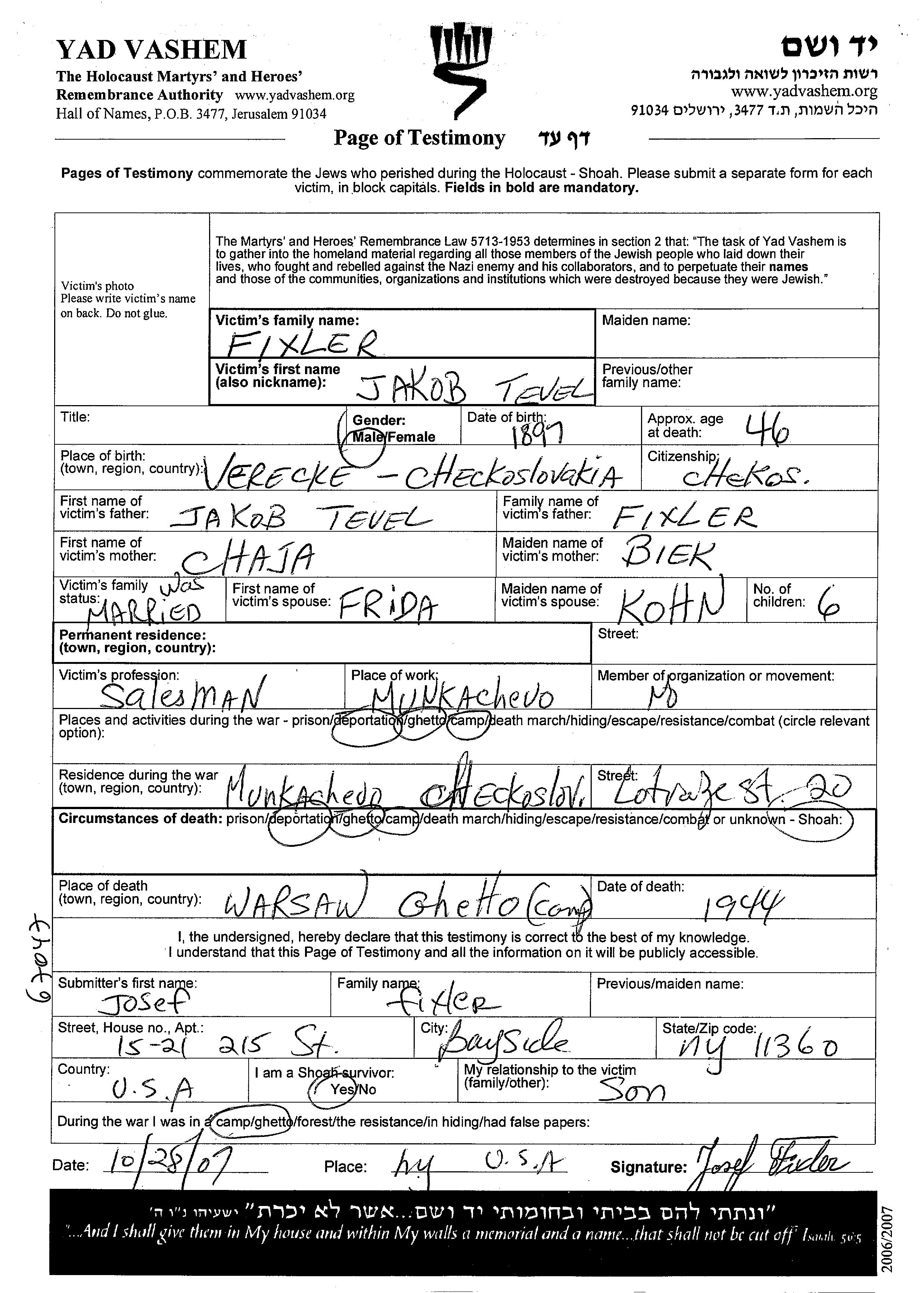 Jakob Tevel Fixler wurde im Jahr 1897 in Verecke, Tschechoslowakei geboren. Er war der Sohn von Chaja, geb. Biek. Er war Handelsvertreter/in und mit Frida, geb. Kohn Verheiratet. Während des Krieges war er in Munkacevo, Tschechoslowakei.