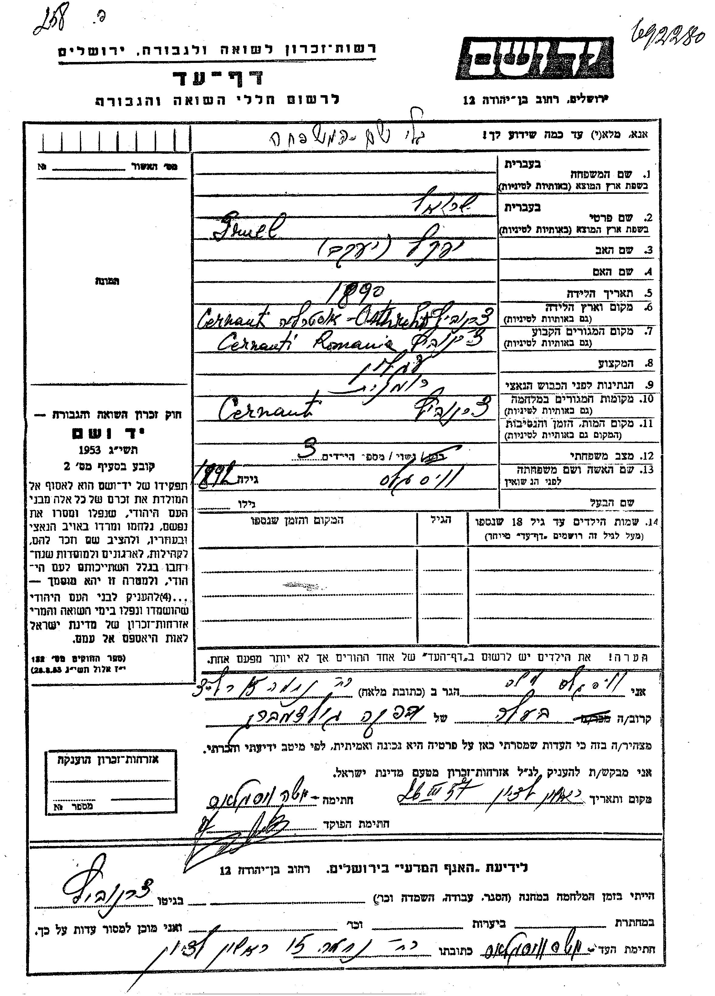Sruel Name unbekannt wurde im Jahr 1890 in Cernauti, Rumänien geboren. Er war der Sohn von Yaakov. Er war Fuhrmann und Verheiratet. Vor dem Zweiten Weltkrieg lebte er in Cernauti, Rumänien. Während des Krieges war er in Cernauti, Rumänien.