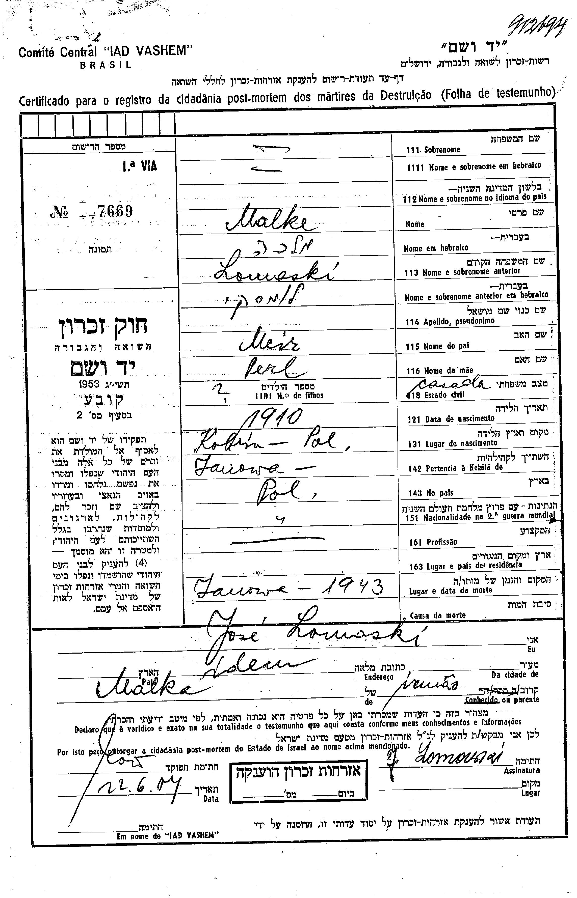 Malka Name unbekannt, geb. Lomaski wurde im Jahr 1910 in Kobrin, Polen geboren. Sie war die Tochter von Meir und Pearl. Sie war Verheiratet. Vor dem Zweiten Weltkrieg lebte sie in Janowa, Polen.