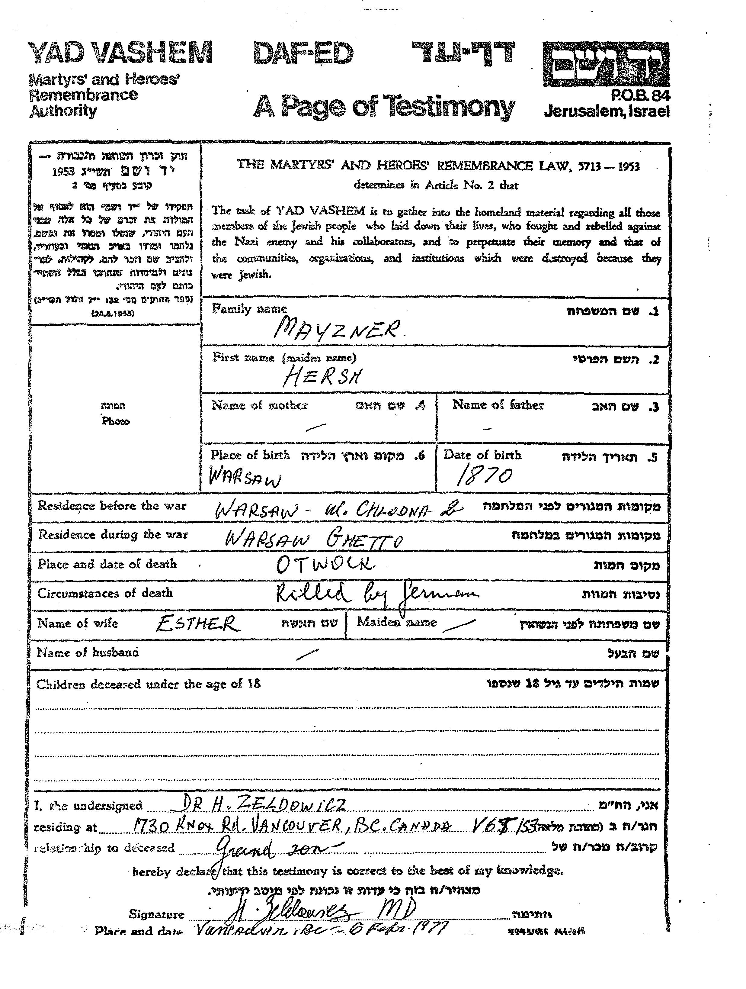 Hersh Mayzner wurde im Jahr 1870 in Warschau, Polen geboren. Vor dem Zweiten Weltkrieg lebte er in Warschau, Polen. Während des Krieges war er in Warschau, Polen.