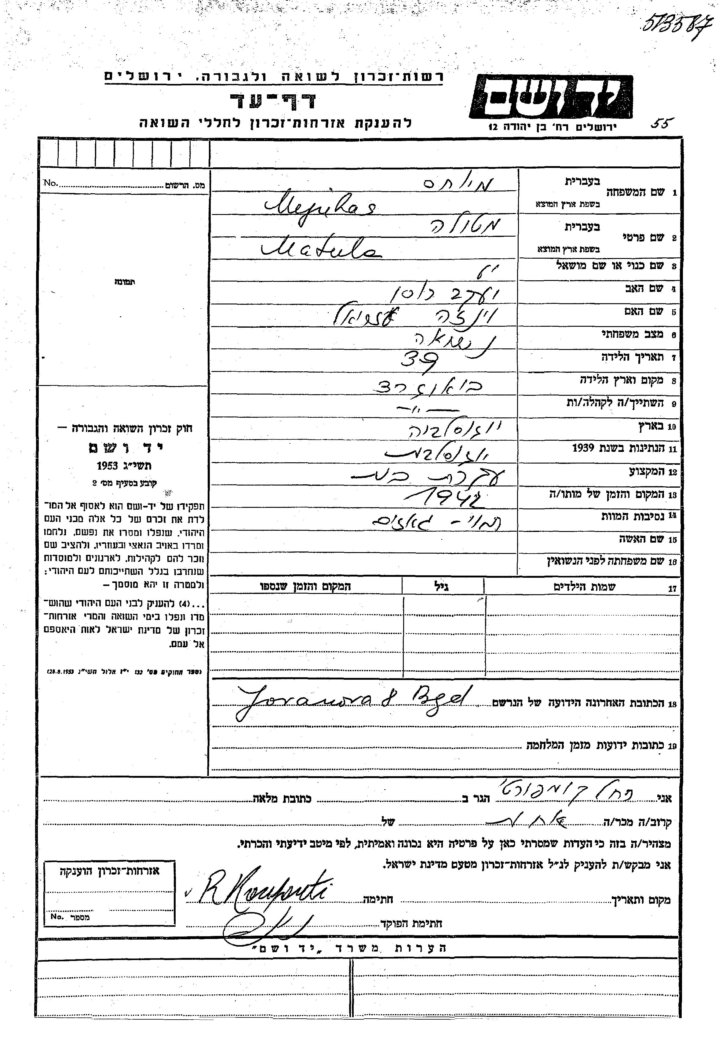 Matula Mejuhas wurde in Beograd, Jugoslawien geboren. Sie war die Tochter von Yaakov Rikhard und Vineza Azriel. Sie war Hausfrau und Verheiratet. Vor dem Zweiten Weltkrieg lebte sie in Beograd, Jugoslawien. Während des Krieges war sie in Jugoslawien.