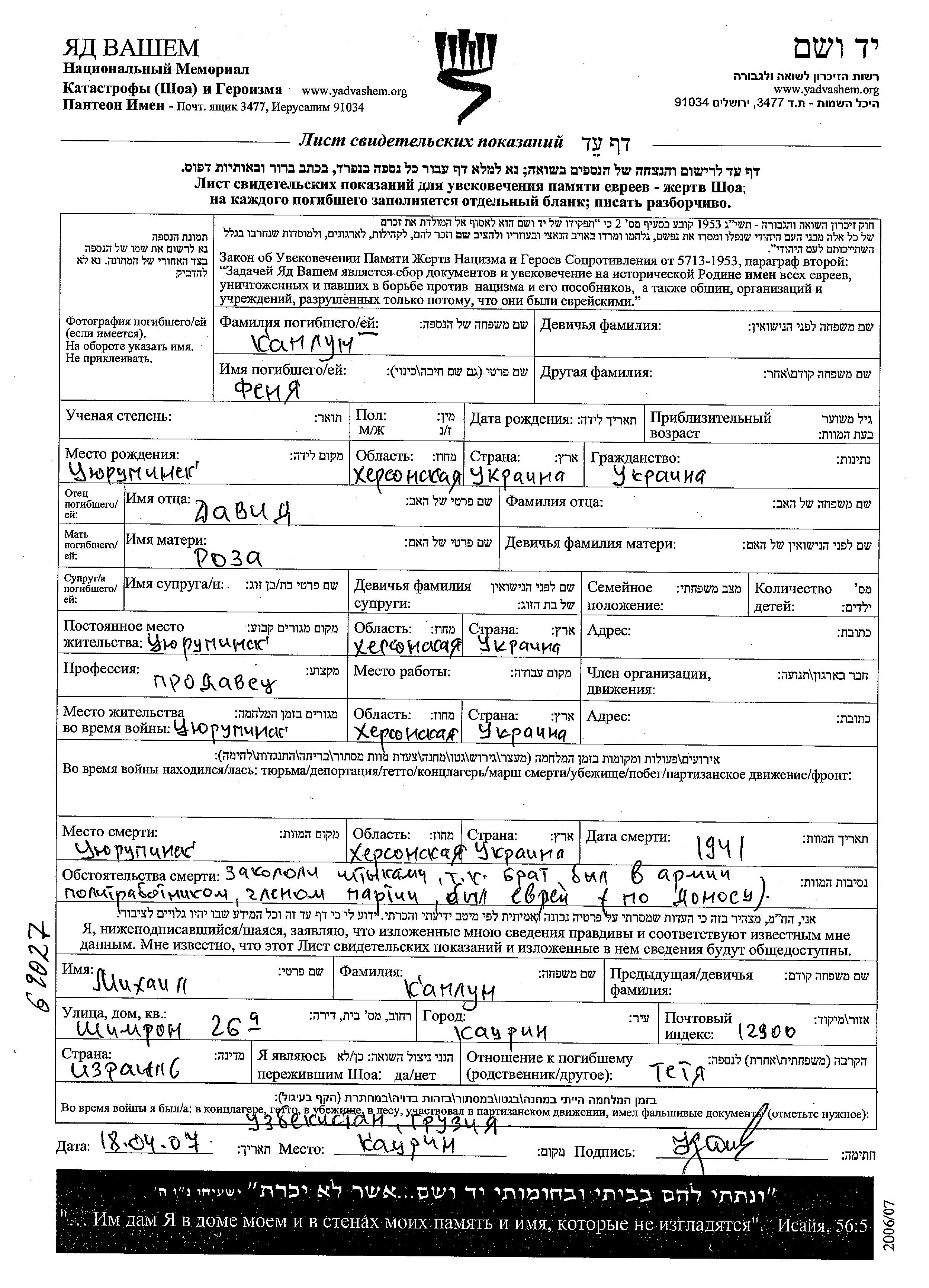 Fenya wurde in der Schoah ermordet. Todesort: Tsyurupinsk, Ukraine (UdSSR) im Jahr 1941.