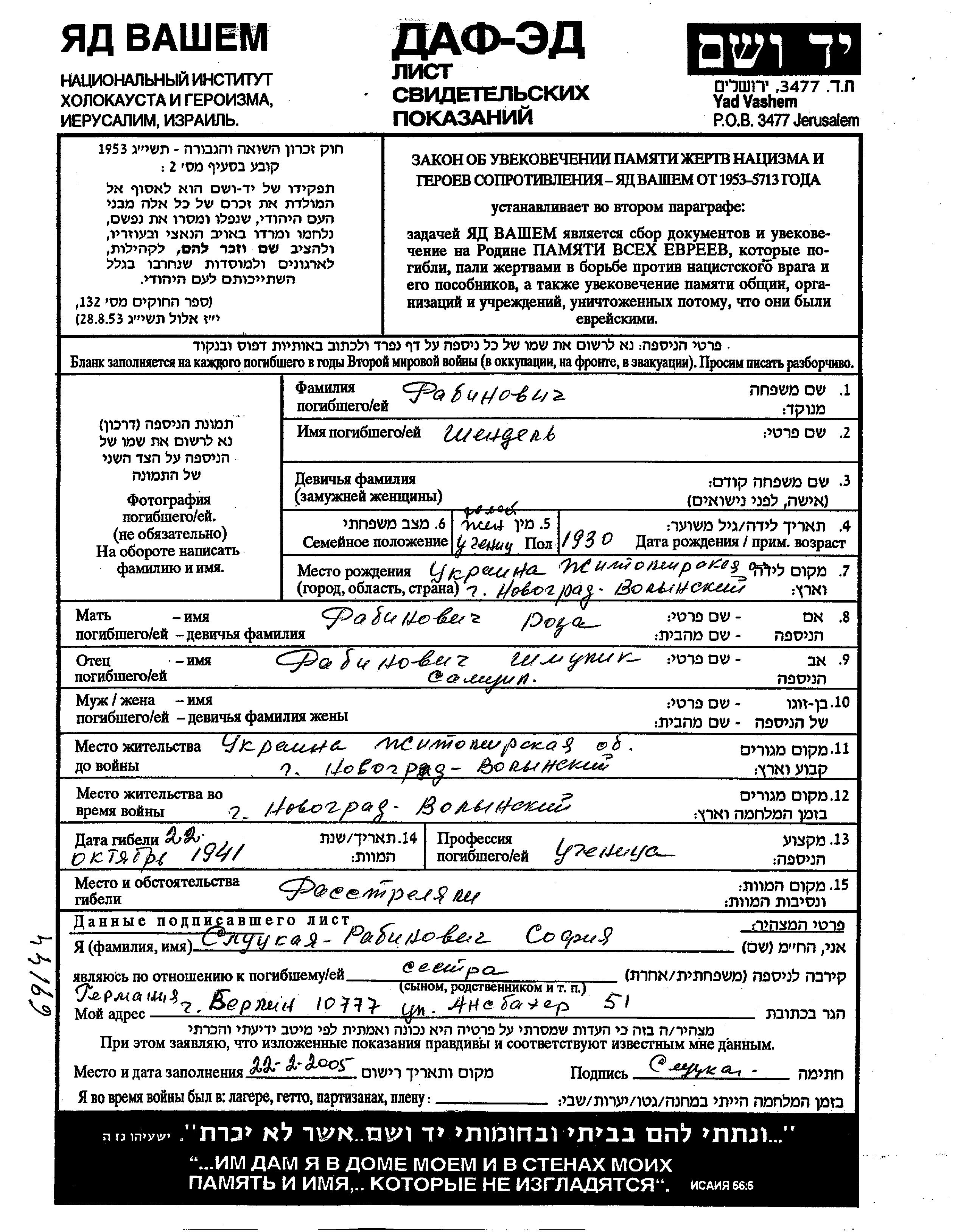 Shendel Rabinovich wurde im Jahr 1930 in Novograd Volynsk, Ukraine (UdSSR) geboren. Sie war die Tochter von Shmulik und Roza. Sie war Schüler/-in und Kind. Vor dem Zweiten Weltkrieg lebte sie in Novograd Volynsk, Ukraine (UdSSR). Während des Krieges war sie in Novograd Volynsk, Ukraine (UdSSR).