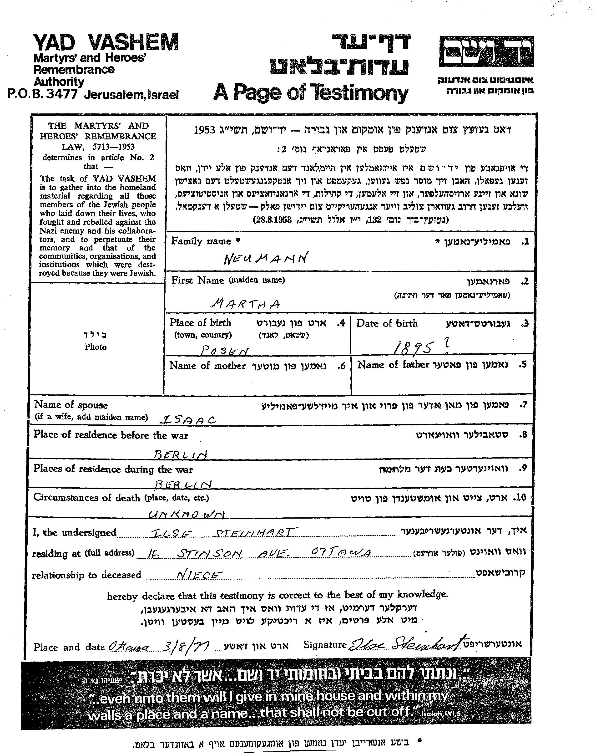 Neumann Marta 1895 Berlin, Deutsches Reich Gedenkblatt