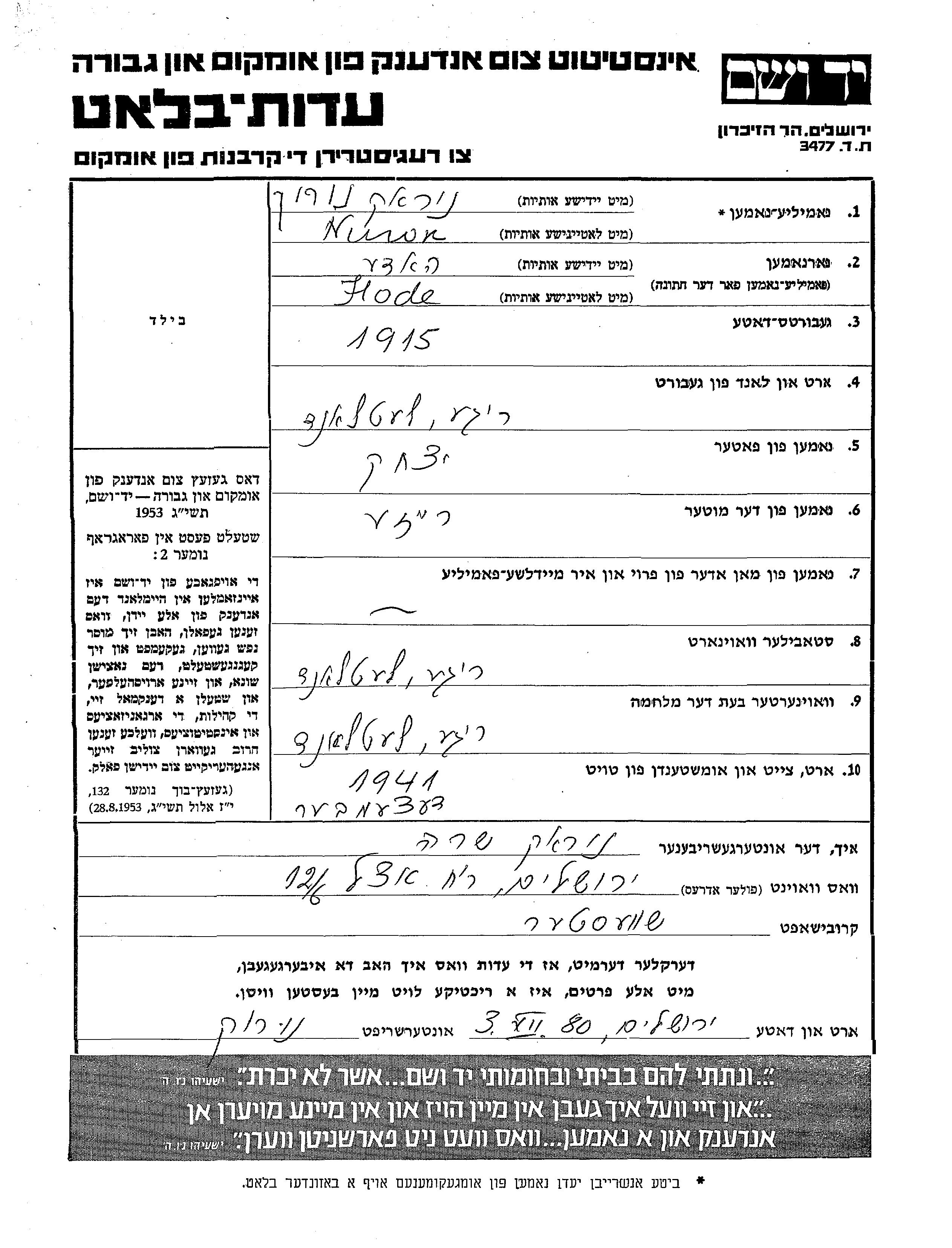 Hode wurde in der Schoah ermordet. Todesort: unbekannt im Jahr 12/1941.