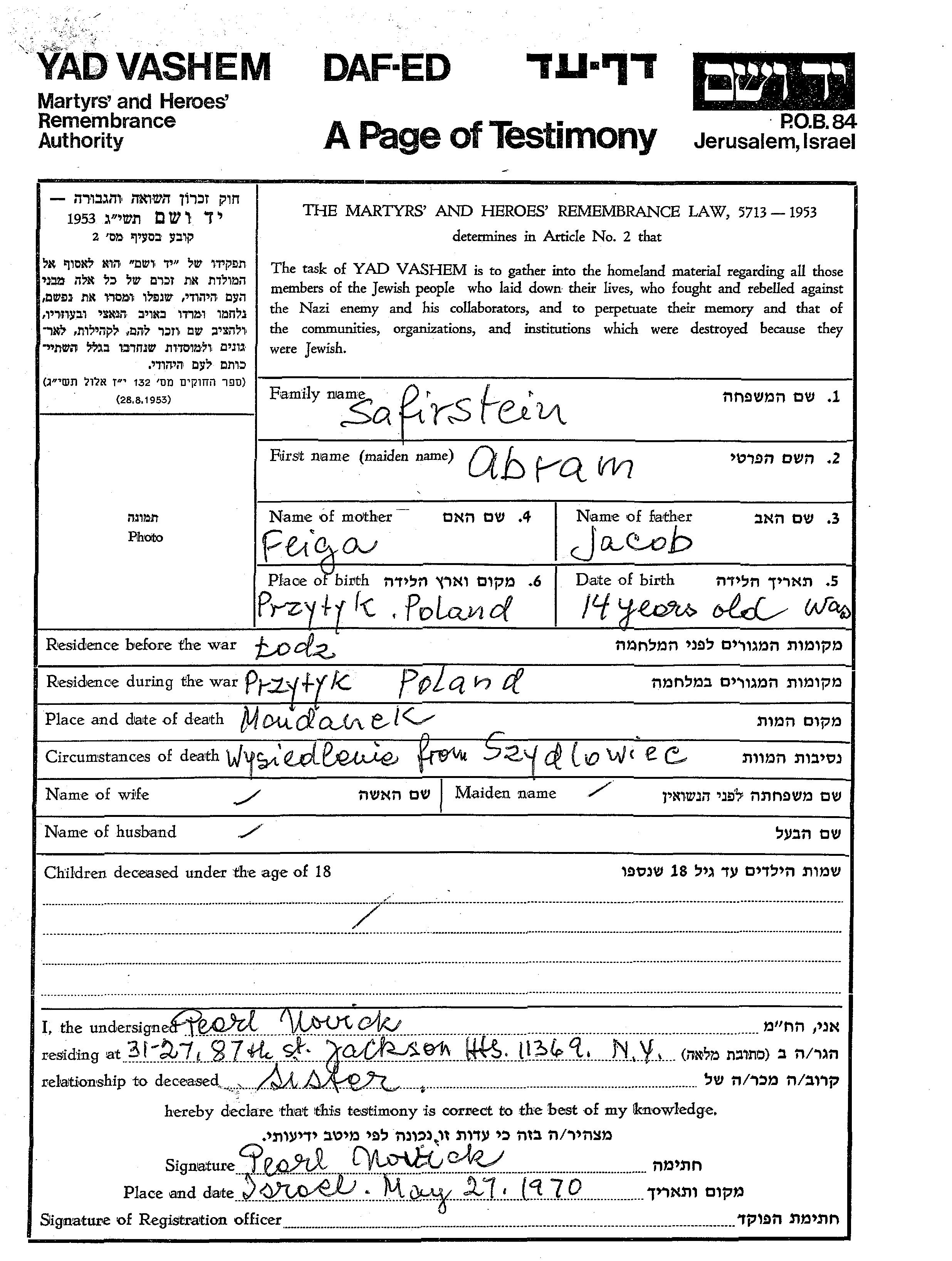 Abram Safirstein wurde in Przytyk, Polen geboren. Er war der Sohn von Jacob und Feiga. Er war Ledig. Vor dem Zweiten Weltkrieg lebte er in Lodz, Polen. Während des Krieges war er in Przytyk, Polen.
