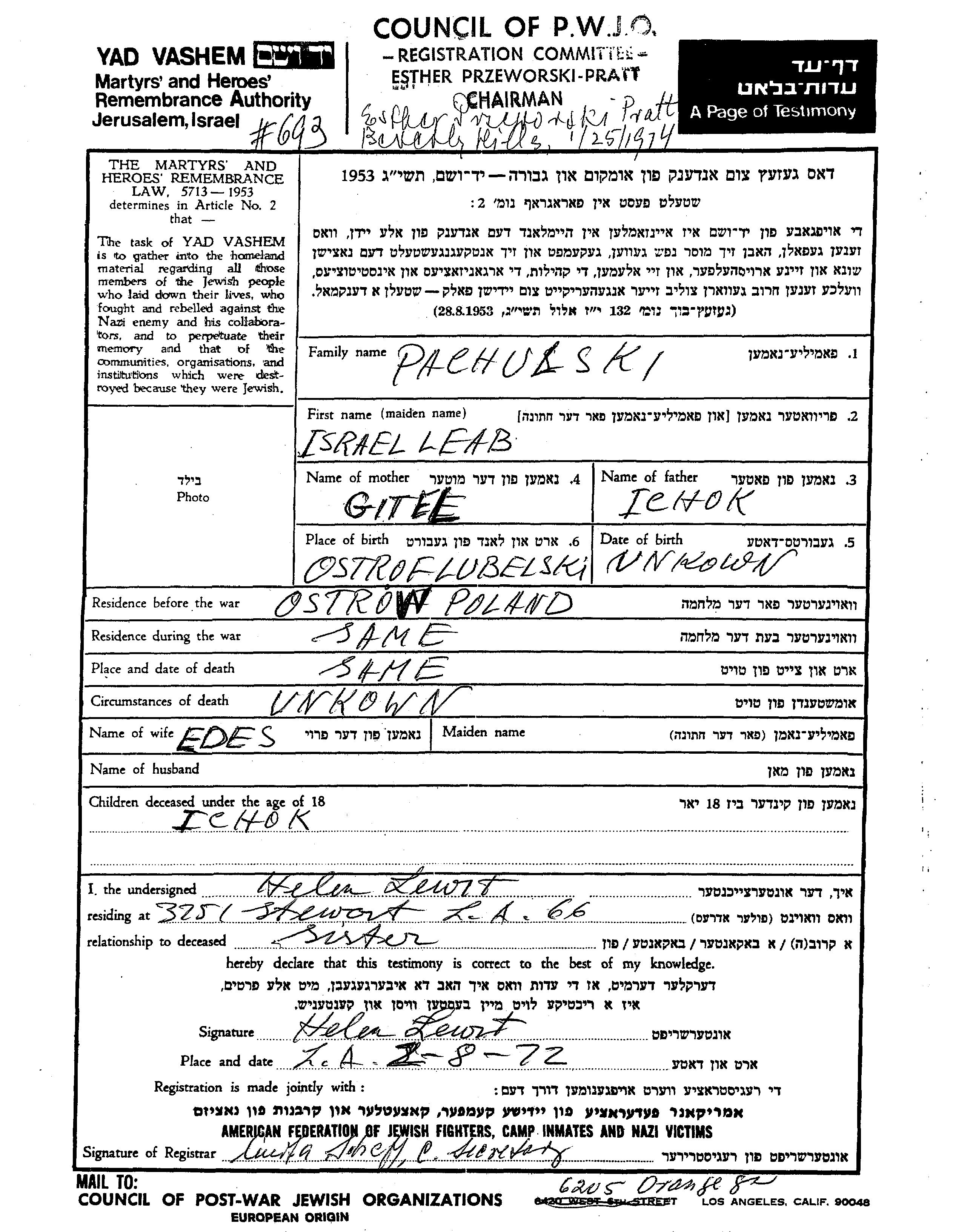 Israel Leab Pachulski wurde in Ostrow, Polen geboren. Er war der Sohn von Ichok und Gitel. Er war mit Edes Verheiratet. Vor dem Zweiten Weltkrieg lebte er in Ostrow, Polen. Während des Krieges war er in Ostrow, Polen.