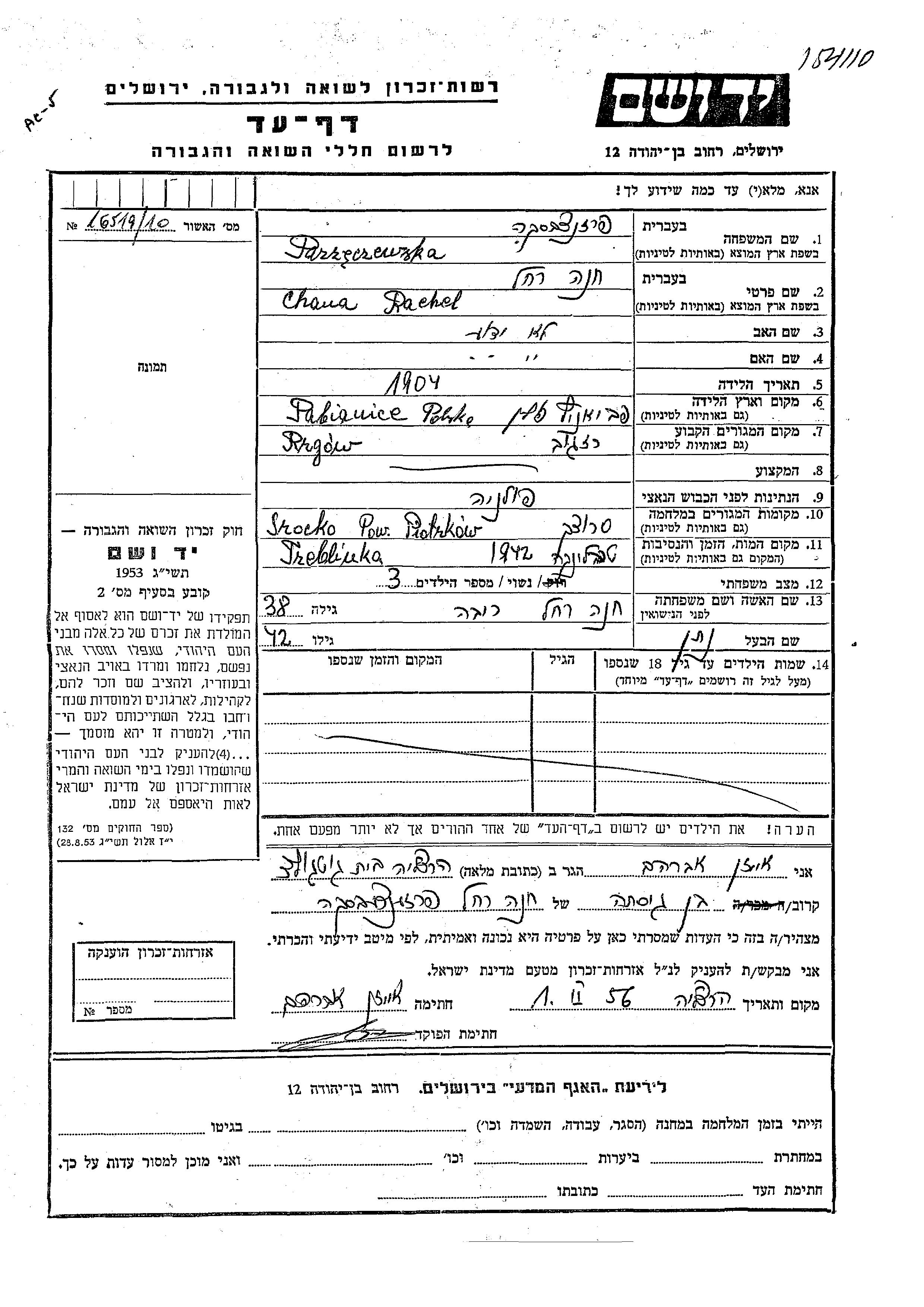 Chana Rachel Pazhenchevski, geb. Riba wurde im Jahr 1904 in Pabianice, Polen geboren. Sie war mit Natan Verheiratet. Vor dem Zweiten Weltkrieg lebte sie in Rzgow, Polen. Während des Krieges war sie in Srocko, Polen.