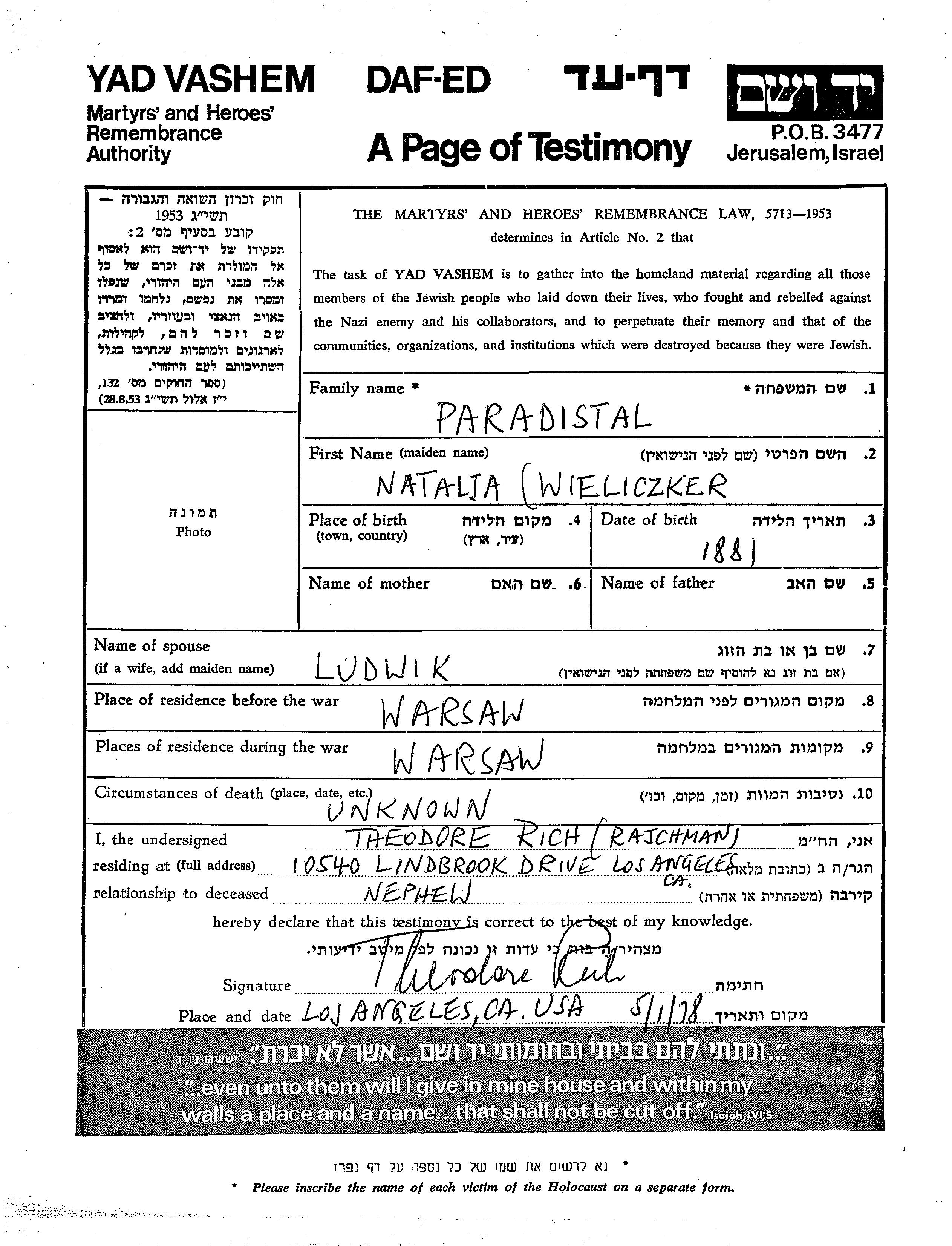 Natalia Paradistal, geb. Wieliczker wurde im Jahr 1881 geboren. Vor dem Zweiten Weltkrieg lebte sie in Varsha, Polen. Während des Krieges war sie in Varsha, Polen.