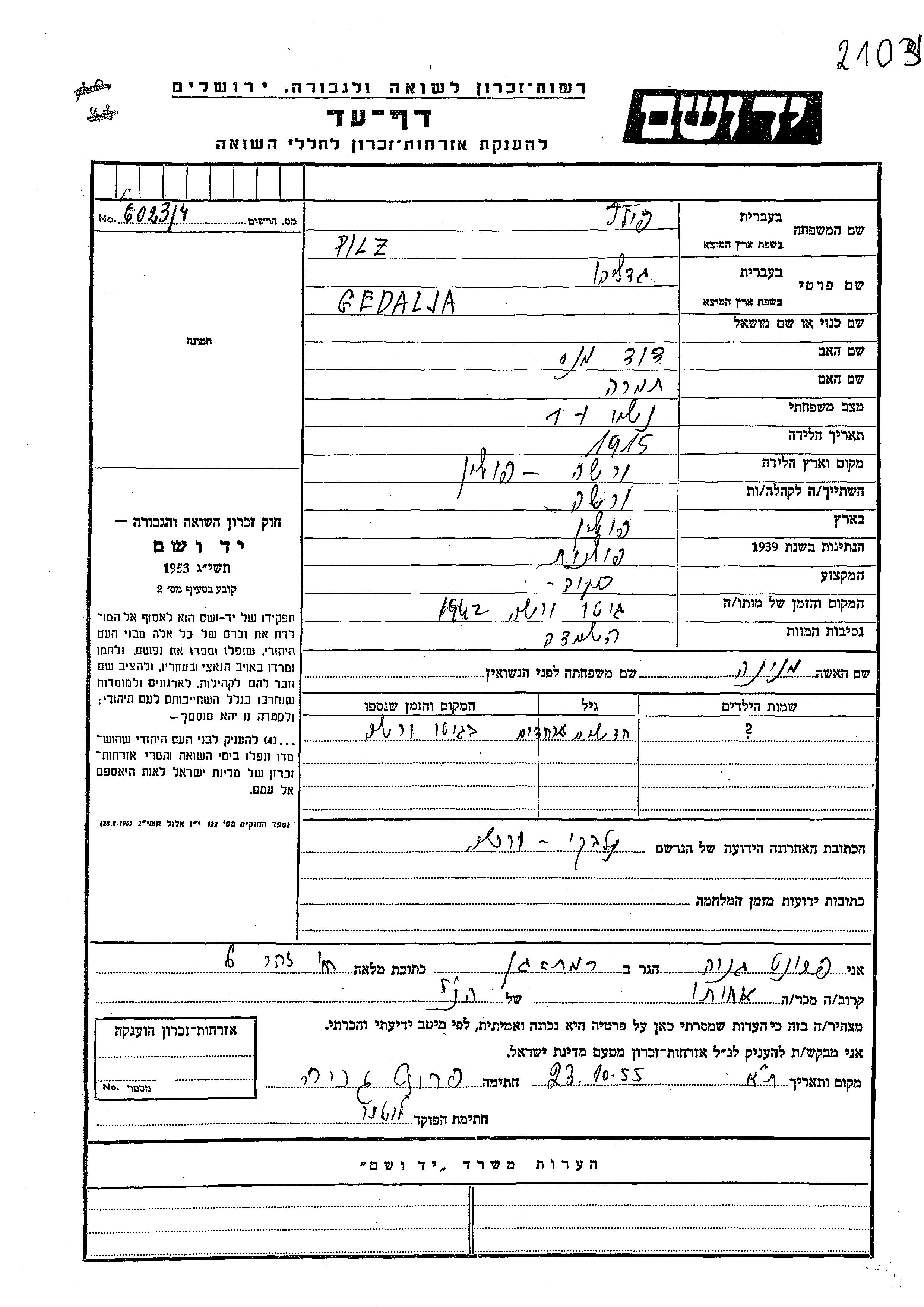Gedalja wurde in der Schoah ermordet. Todesort: Warszawa, Polen im Jahr 1942.