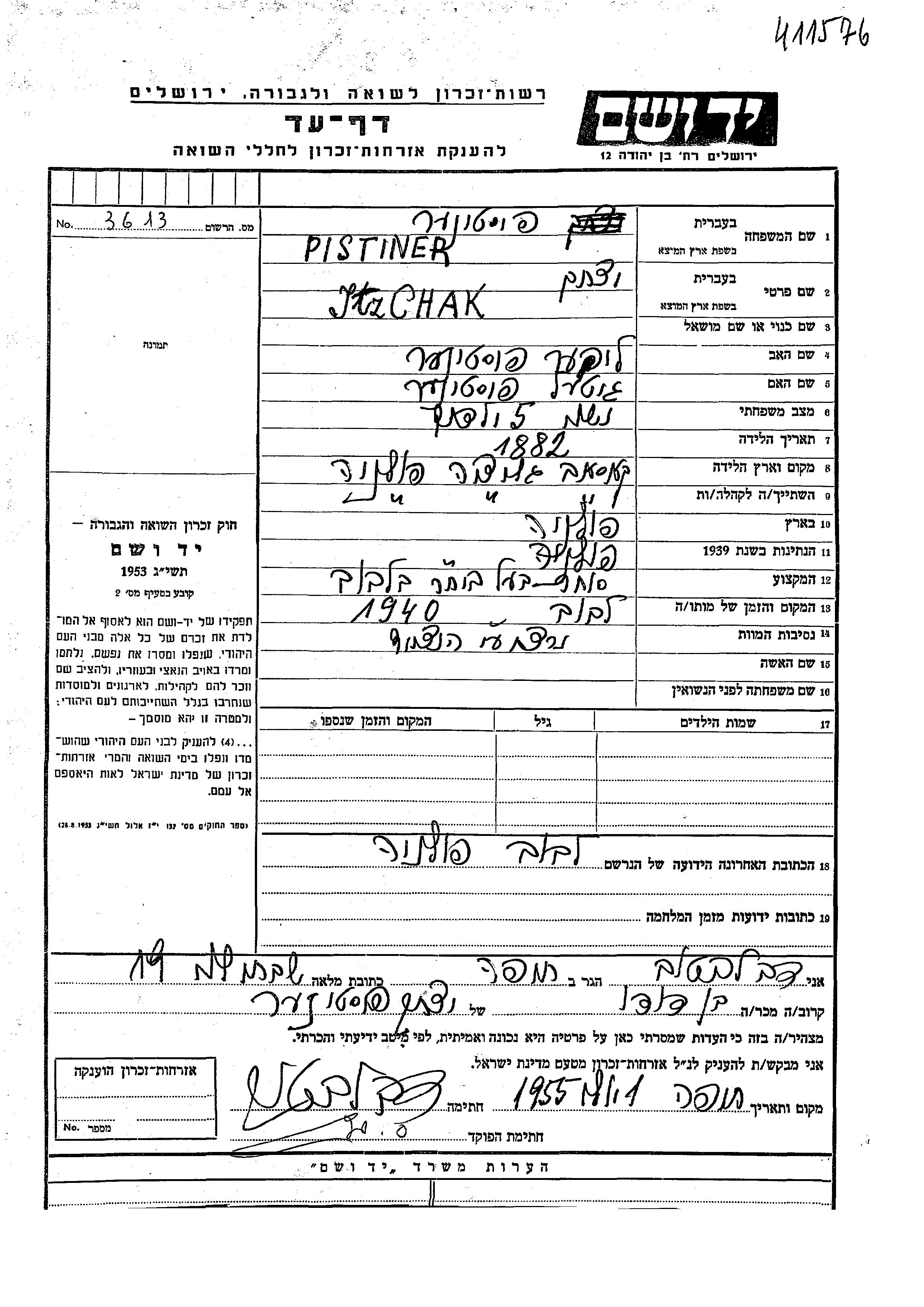 Itzchak Pistiner wurde im Jahr 1882 in Kosow, Polen geboren. Er war der Sohn von Liber und Gitel. Er war Fabrikant/-in und Verheiratet. Während des Krieges war er in Lwow, Polen.