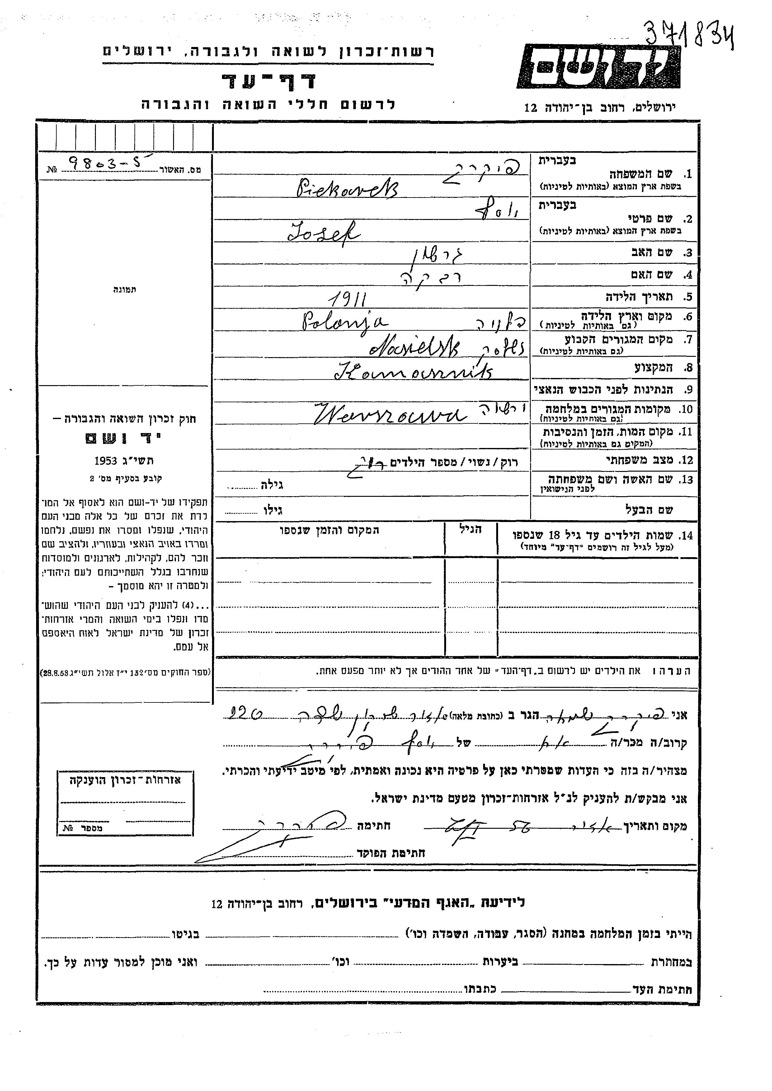 Josef Piekarek wurde im Jahr 1911 in Polen geboren. Er war der Sohn von Gershon und Rivka. Er war Schuster/-in und Ledig. Vor dem Zweiten Weltkrieg lebte er in Nasielsk, Polen. Während des Krieges war er in Warszawa, Polen.