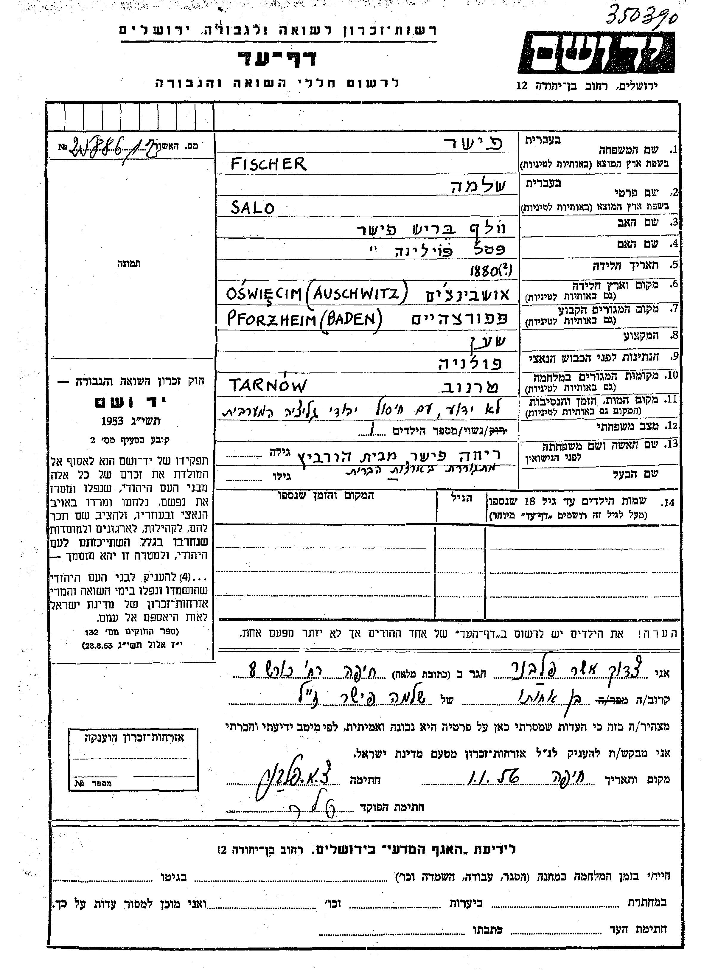Salo Fischer wurde im Jahr 1880 in Oświęcim, Polen geboren. Er war der Sohn von Volf Berish und Pesel Poilina. Er war Uhrmacher/-in und mit Rima, geb. Hurvitz Verheiratet. Vor dem Zweiten Weltkrieg lebte er in Pforzheim, Deutsches Reich. Während des Krieges war er in Tarnow, Polen.