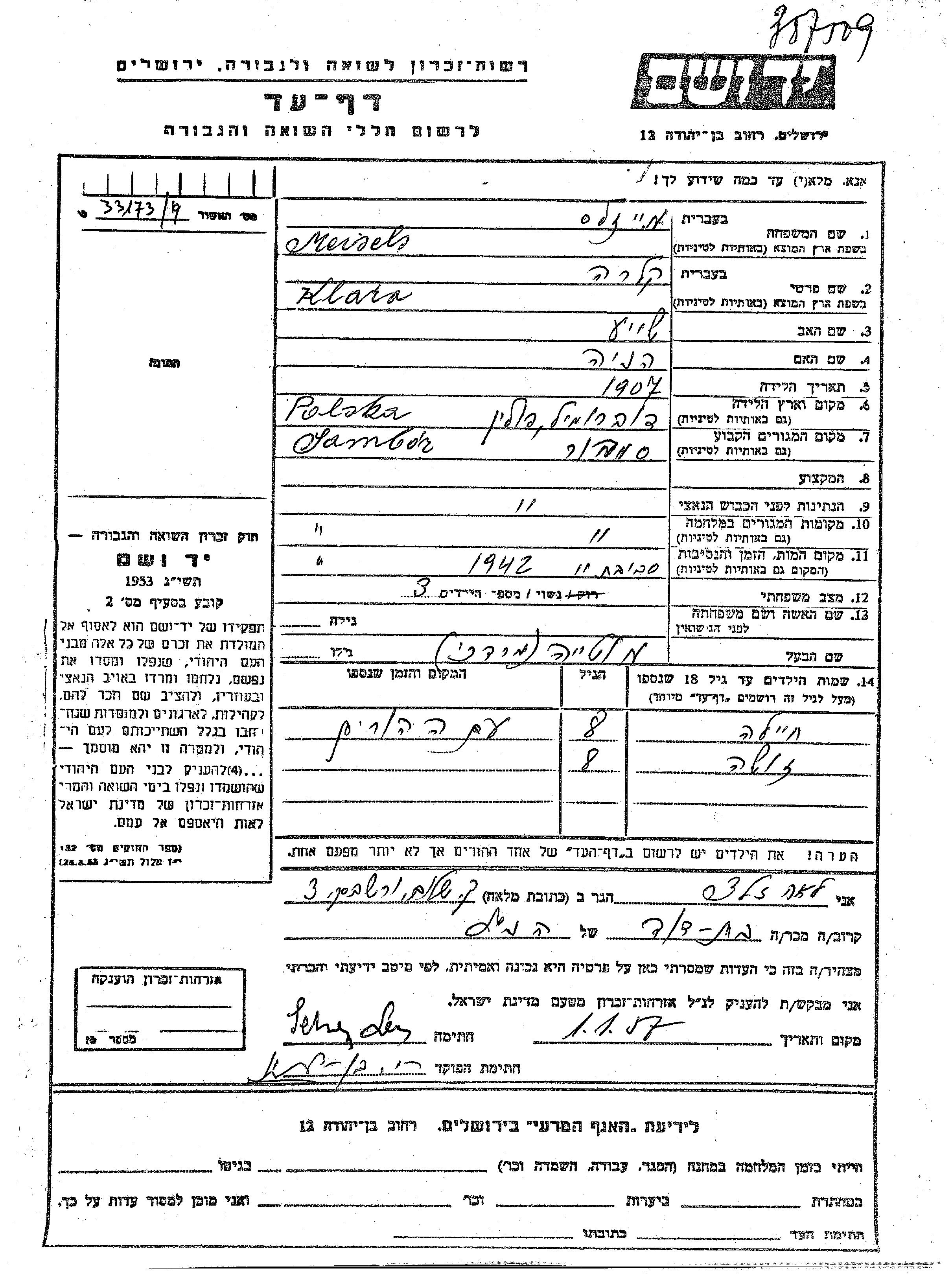 Klara Meisels wurde im Jahr 1907 in Dobromil, Polen geboren. Sie war die Tochter von Shiye und Henia. Sie war mit Mordekhai Verheiratet. Vor dem Zweiten Weltkrieg lebte sie in Sambor, Polen. Während des Krieges war sie in Sambor, Polen.