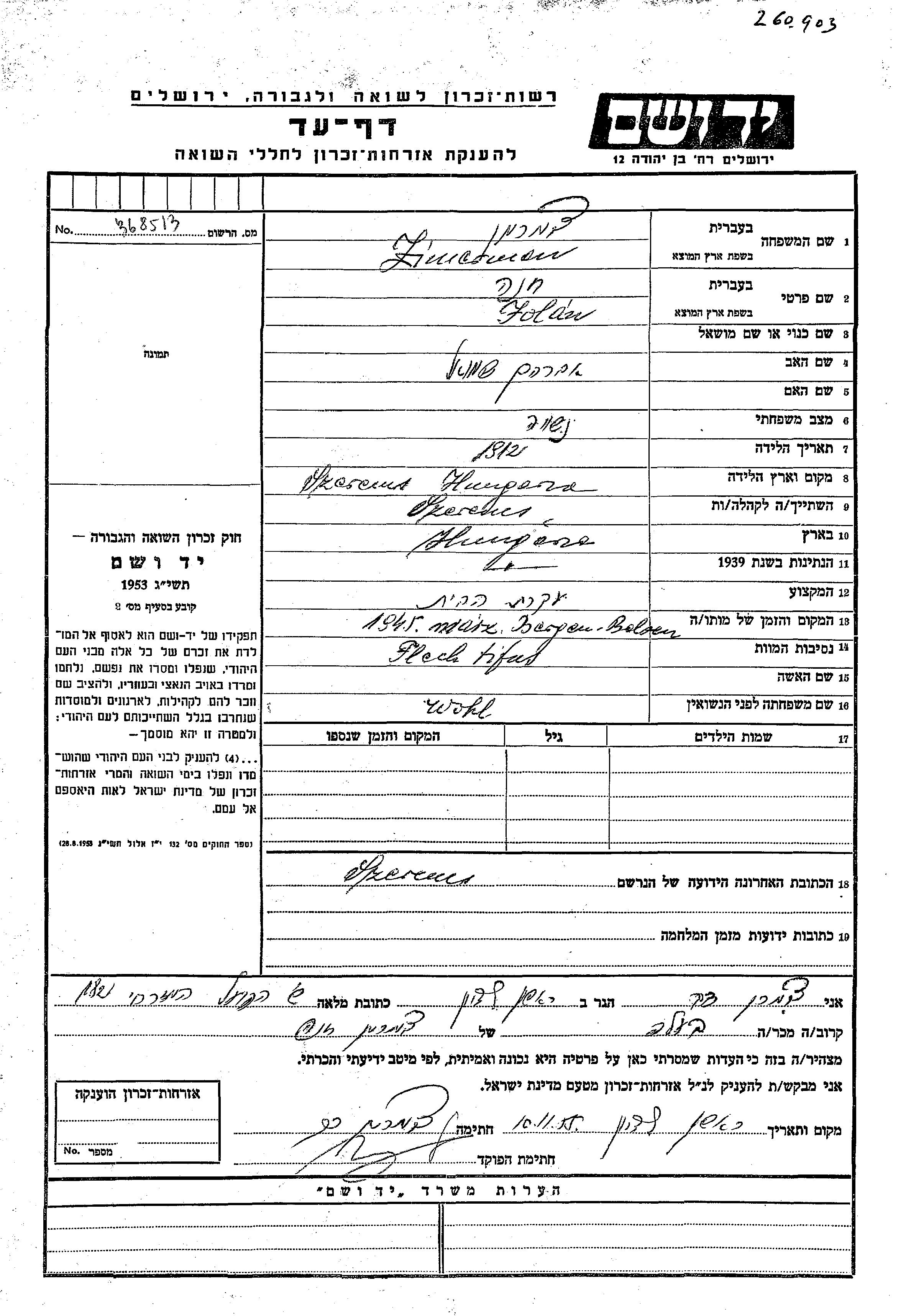Jolan Khana Zimerman Tzimerman, geb. Wohl wurde im Jahr 1912 in Szerencs, Ungarn geboren. Sie war die Tochter von Avraham Shmuel. Sie war Hausfrau und mit Dov Verheiratet. Vor dem Zweiten Weltkrieg lebte sie in Szerencs, Ungarn. Während des Krieges war sie in Szerencs, Ungarn.