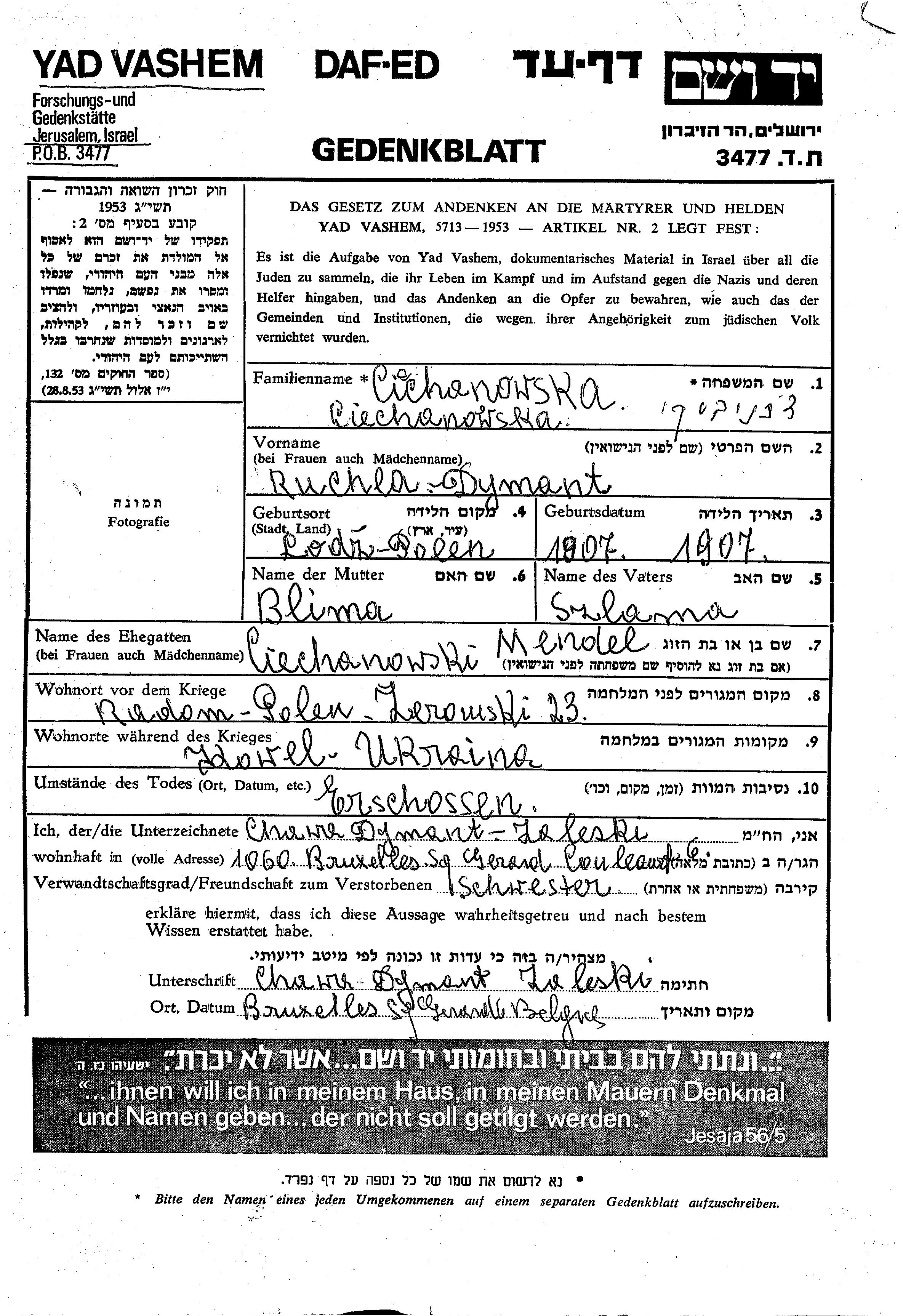 Ruchla Ciechanowska, geb. Dymant wurde im Jahr 1907 in Lodz, Polen geboren. Sie war die Tochter von Szlama und Blima. Sie war mit Mendel Verheiratet. Vor dem Zweiten Weltkrieg lebte sie in Radom, Polen. Während des Krieges war sie in Kowel, Polen.