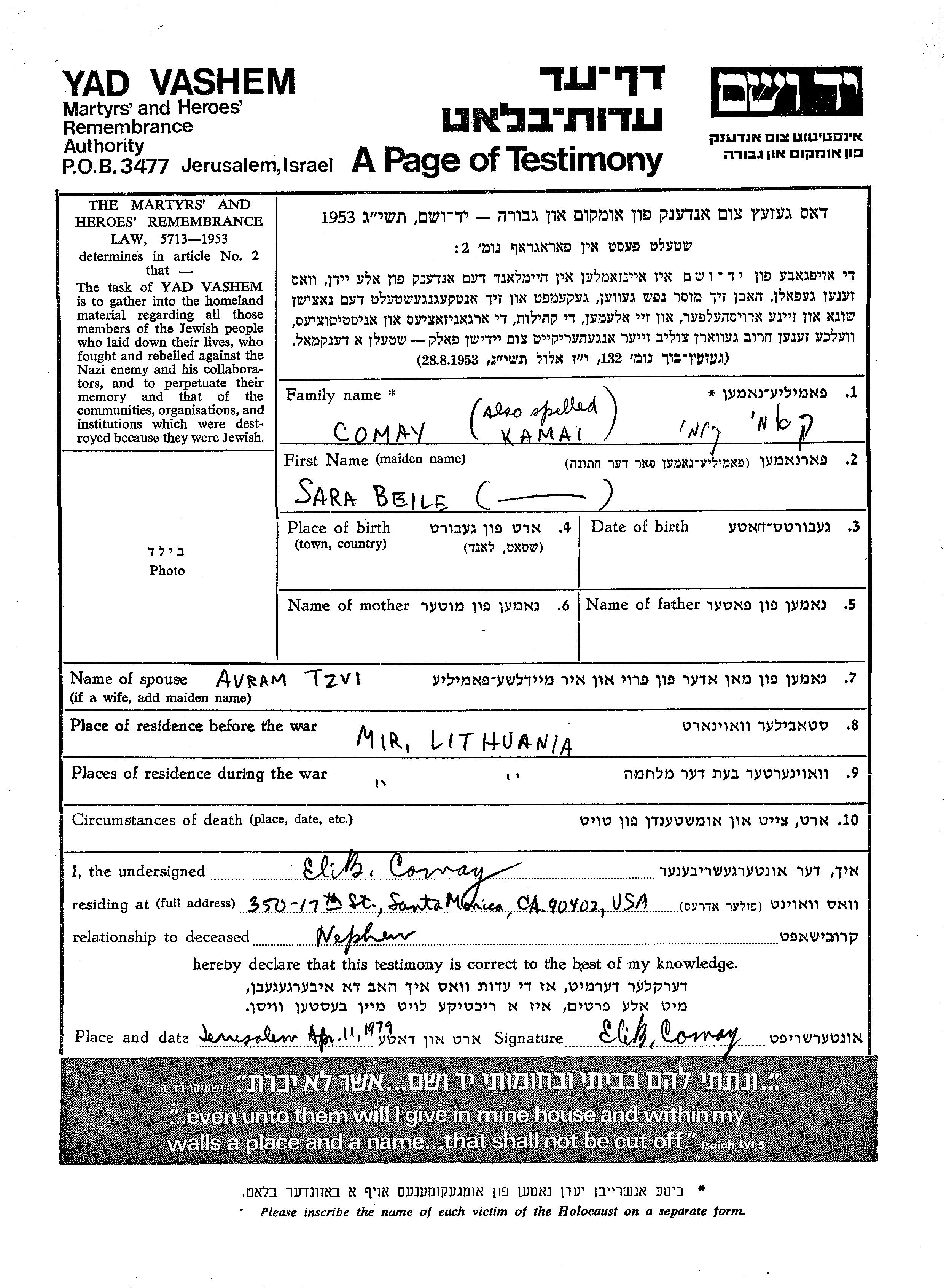 Sara Beile Comay Kamai. Sie war mit Avram Tzvi Verheiratet. Vor dem Zweiten Weltkrieg lebte sie in Mir, Polen. Während des Krieges war sie in Mir, Polen.