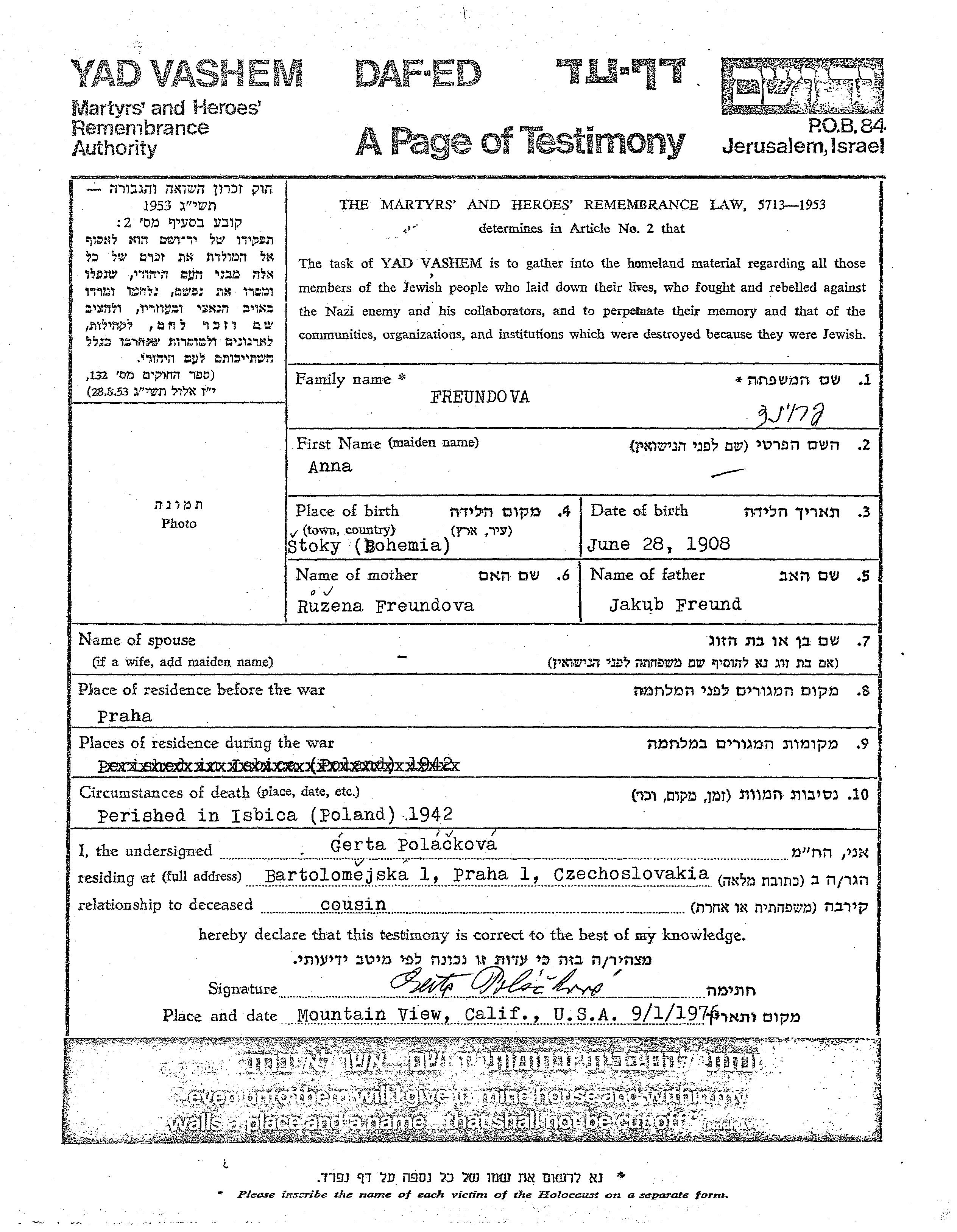 Anna Freundova wurde im Jahr 1908 in Stoky, Tschechoslowakei geboren. Sie war die Tochter von Jakub und Rusena. Vor dem Zweiten Weltkrieg lebte sie in Praha, Tschechoslowakei.
