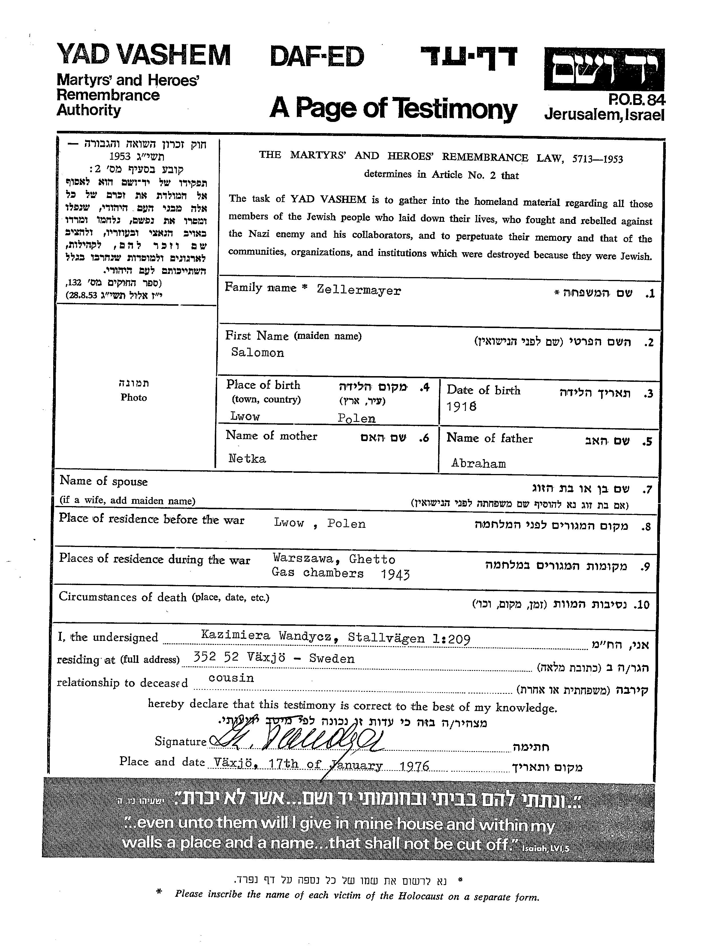 Salomon Zellermayer wurde im Jahr 1918 in Lwow, Polen geboren. Er war der Sohn von Abraham und Netka. Vor dem Zweiten Weltkrieg lebte er in Lwow, Polen. Während des Krieges war er in Warszawa, Polen.