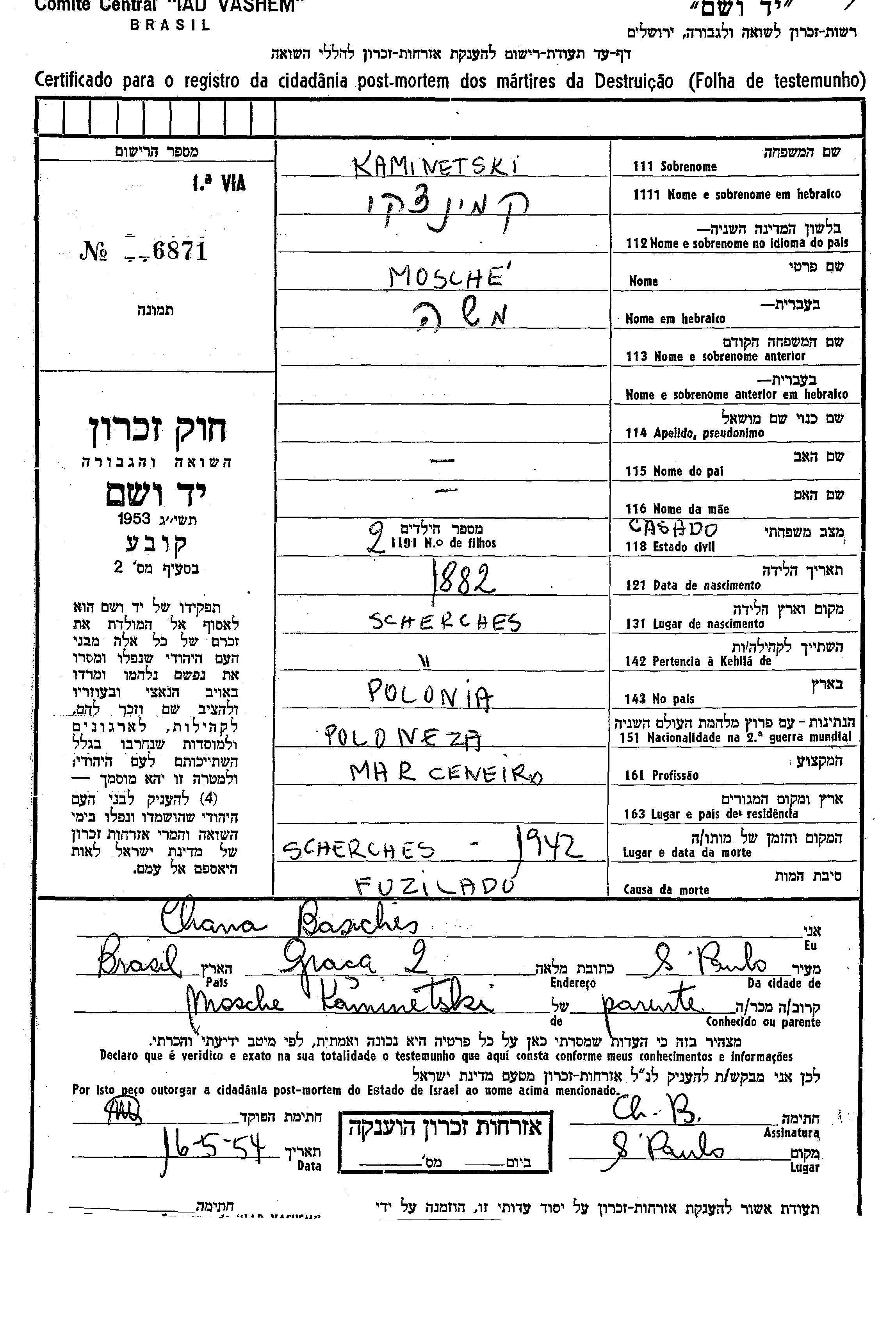 Mosche Kaminetski wurde im Jahr 1882 in Scherches, Polen geboren. Er war Marceneiro und Verheiratet. Vor dem Zweiten Weltkrieg lebte er in Scherches, Polen. Während des Krieges war er in Polen.