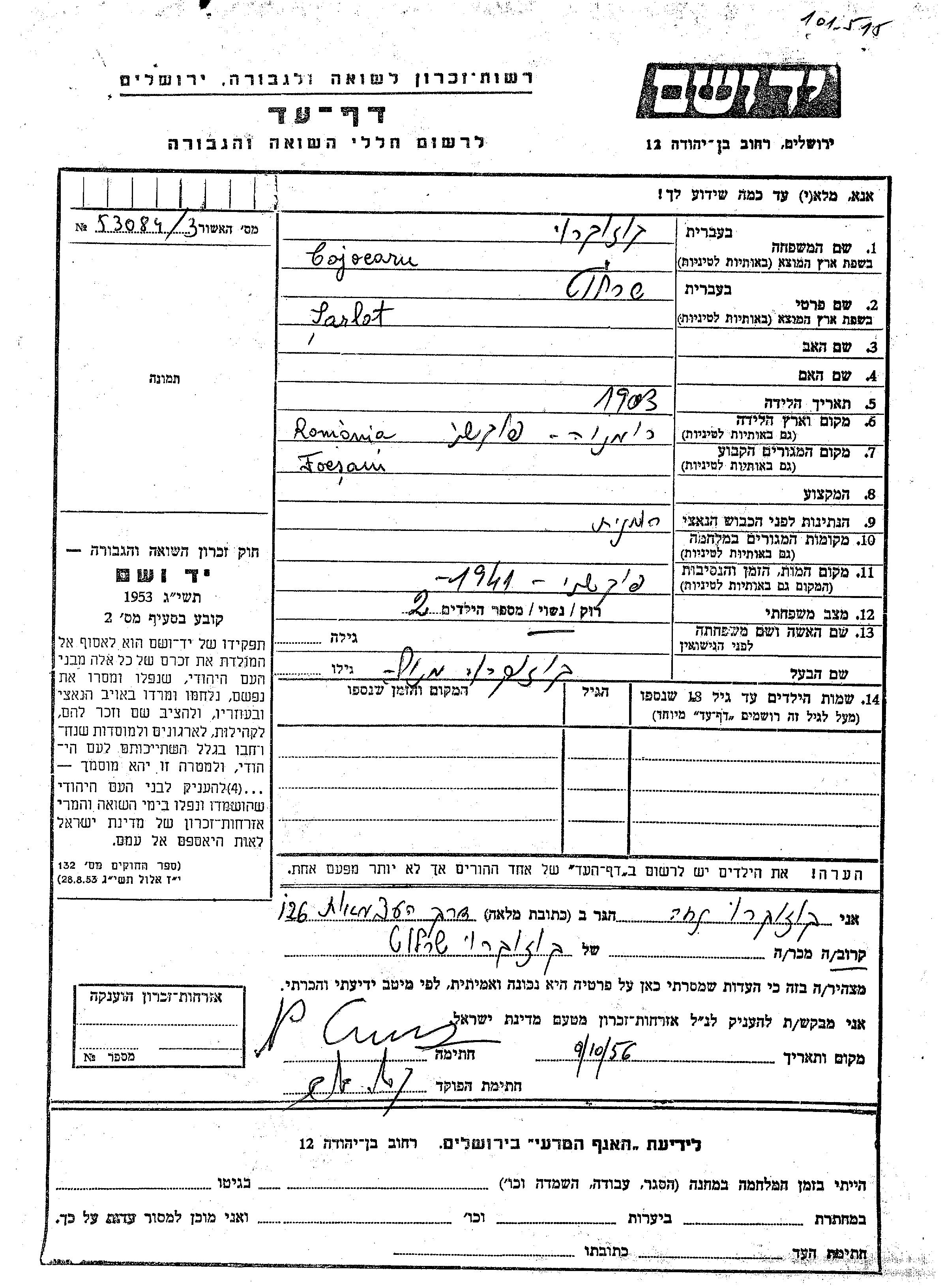 Sarlot wurde in der Schoah ermordet. Todesort: Focsani, Rumänien im Jahr 1941.