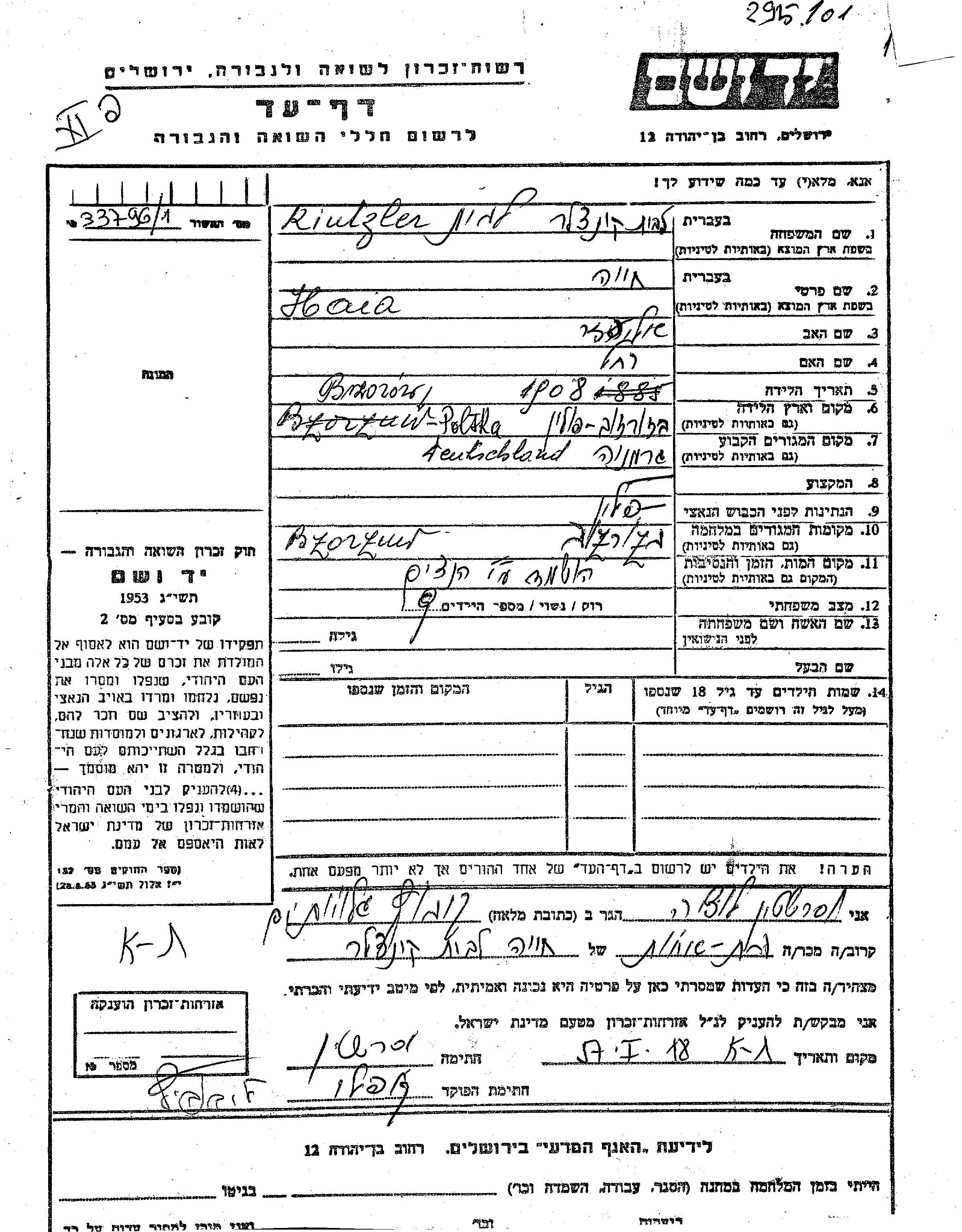 Haia Kintzler, geb. Kintzler wurde im Jahr 1908 in Brzozow, Polen geboren. Sie war die Tochter von Eliezer und Rakhel. Sie war Verheiratet. Vor dem Zweiten Weltkrieg lebte sie in Deutsches Reich. Während des Krieges war sie in Brzozow, Polen.