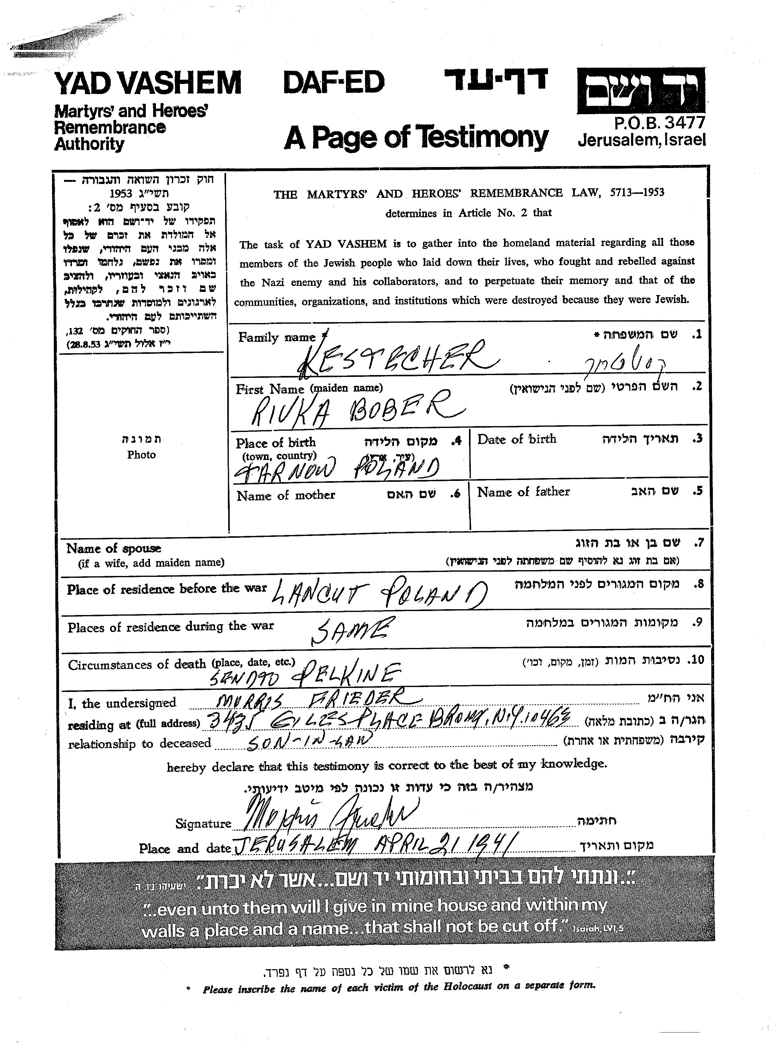 Rivka Kestecher, geb. Bober wurde in Tarnow, Polen geboren. Sie war Verheiratet. Vor dem Zweiten Weltkrieg lebte sie in Lancut, Polen. Während des Krieges war sie in Lancut, Polen.