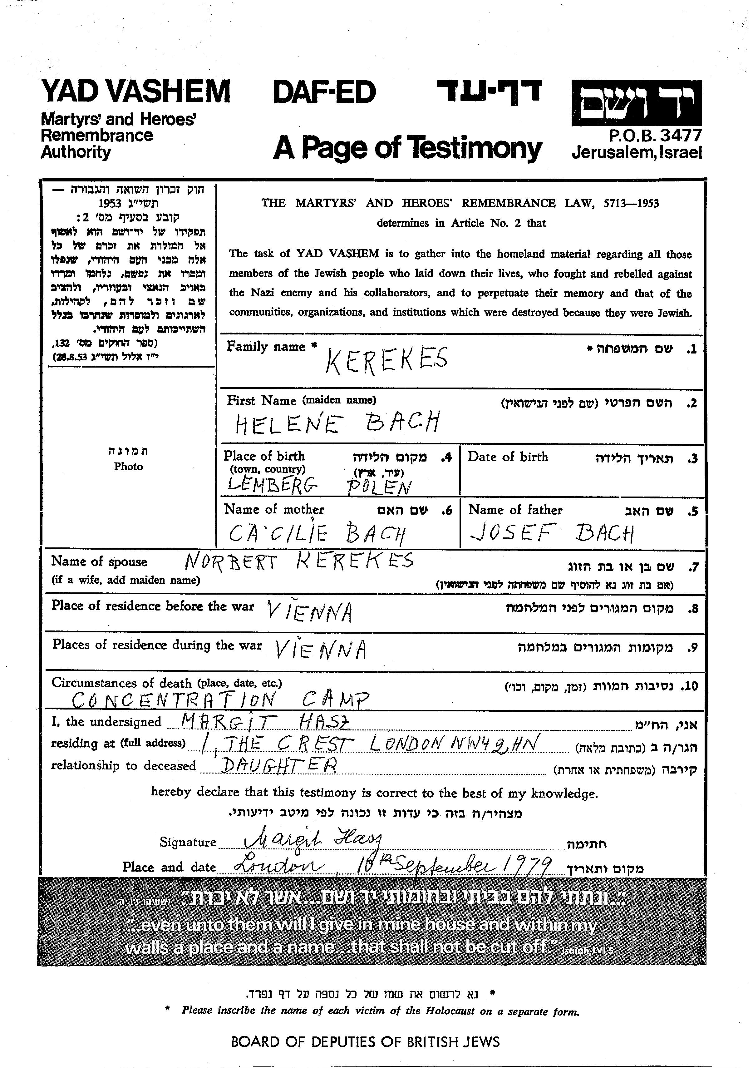 Helene Kerekes, geb. Bach wurde in Lemberg, Polen geboren. Sie war die Tochter von Josef und Cacilie. Sie war mit Norbert Verheiratet. Vor dem Zweiten Weltkrieg lebte sie in Vienna, Österreich. Während des Krieges war sie in Vienna, Österreich.
