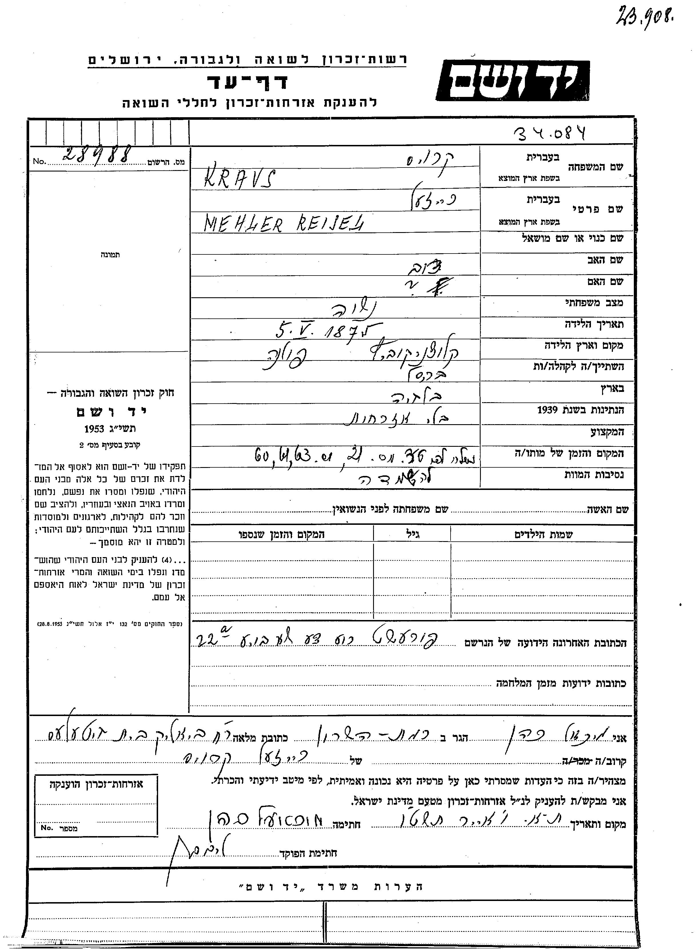 Reijel Reizel Kraus Kros, geb. Mehler wurde im Jahr 1875 in Klucznikowice, Polen geboren. Sie war die Tochter von Dov. Sie war Verheiratet. Vor dem Zweiten Weltkrieg lebte sie in Bruxelles, Belgien.