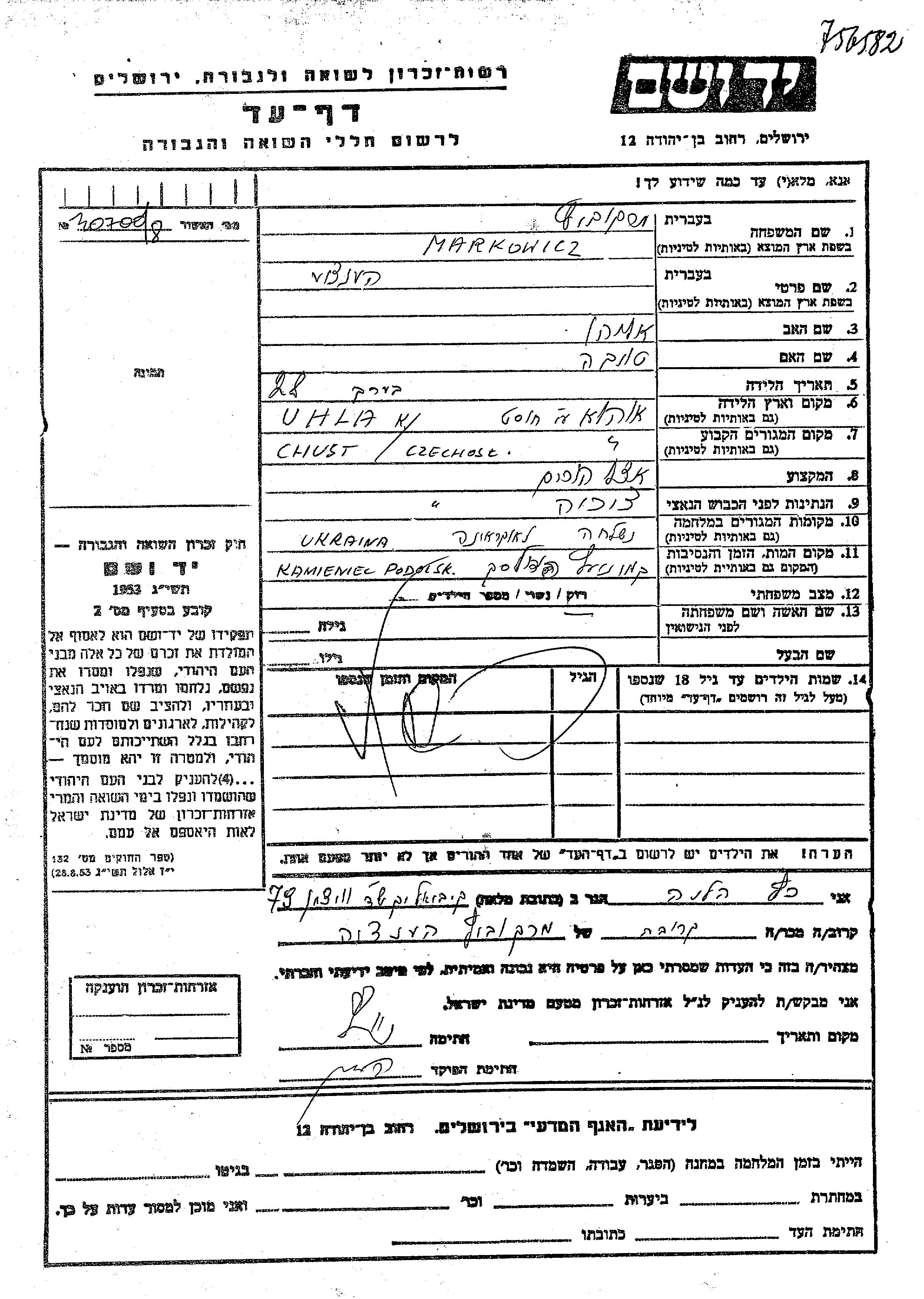 Hentzie Markowicz wurde in Uhla, Tschechoslowakei geboren. Sie war die Tochter von Eliahu und Toibe. Sie war Ledig. Vor dem Zweiten Weltkrieg lebte sie in Uhla, Tschechoslowakei. Während des Krieges war sie in Ukraine (UdSSR).