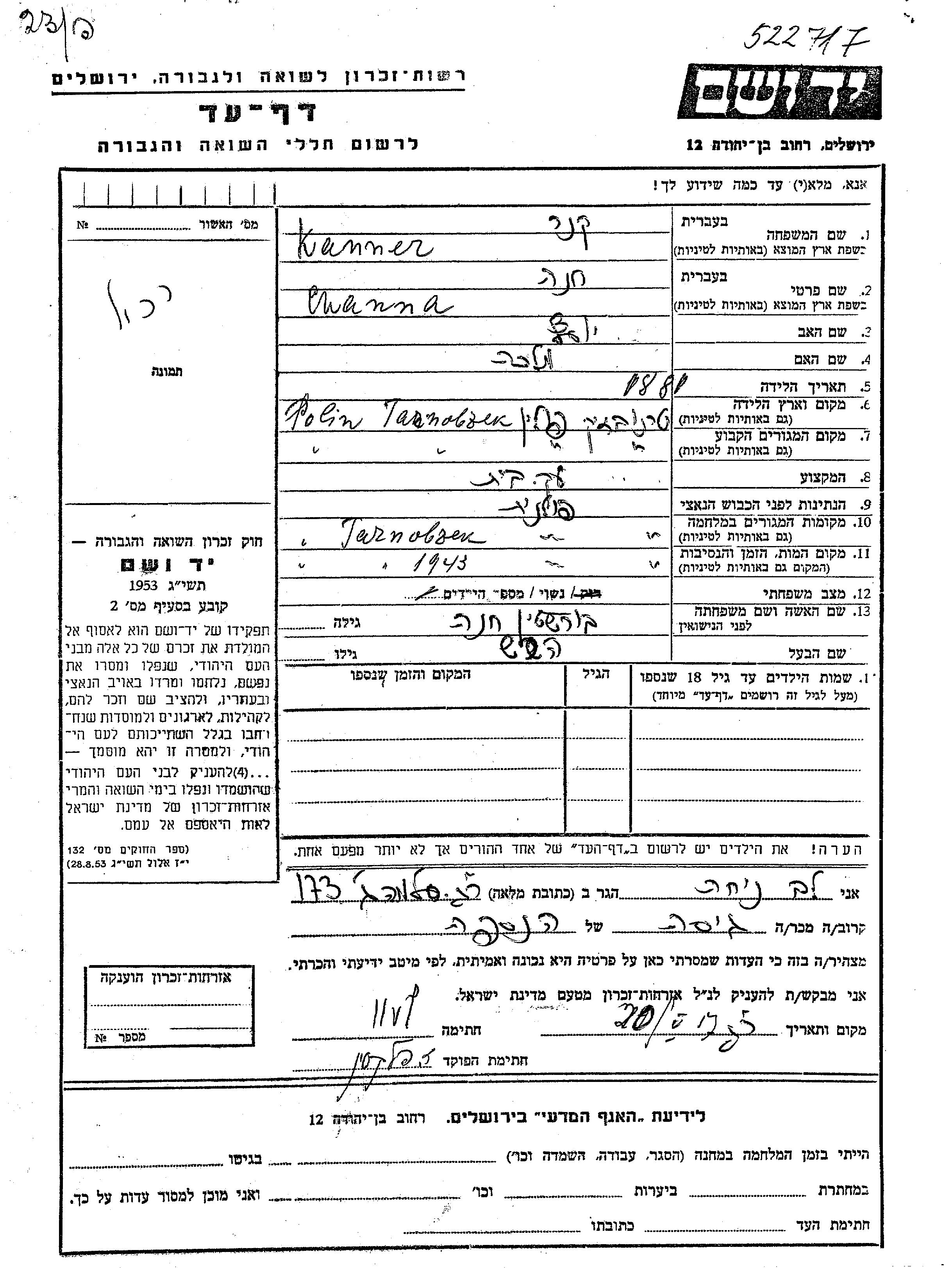 Channa Kanner, geb. Burshtin wurde im Jahr 1881 in Tarnobrzeg, Polen geboren. Sie war die Tochter von Yosef und Malka. Sie war Hausfrau und mit Hersh Verheiratet. Vor dem Zweiten Weltkrieg lebte sie in Tarnobrzeg, Polen. Während des Krieges war sie in Tarnobrzeg, Polen.