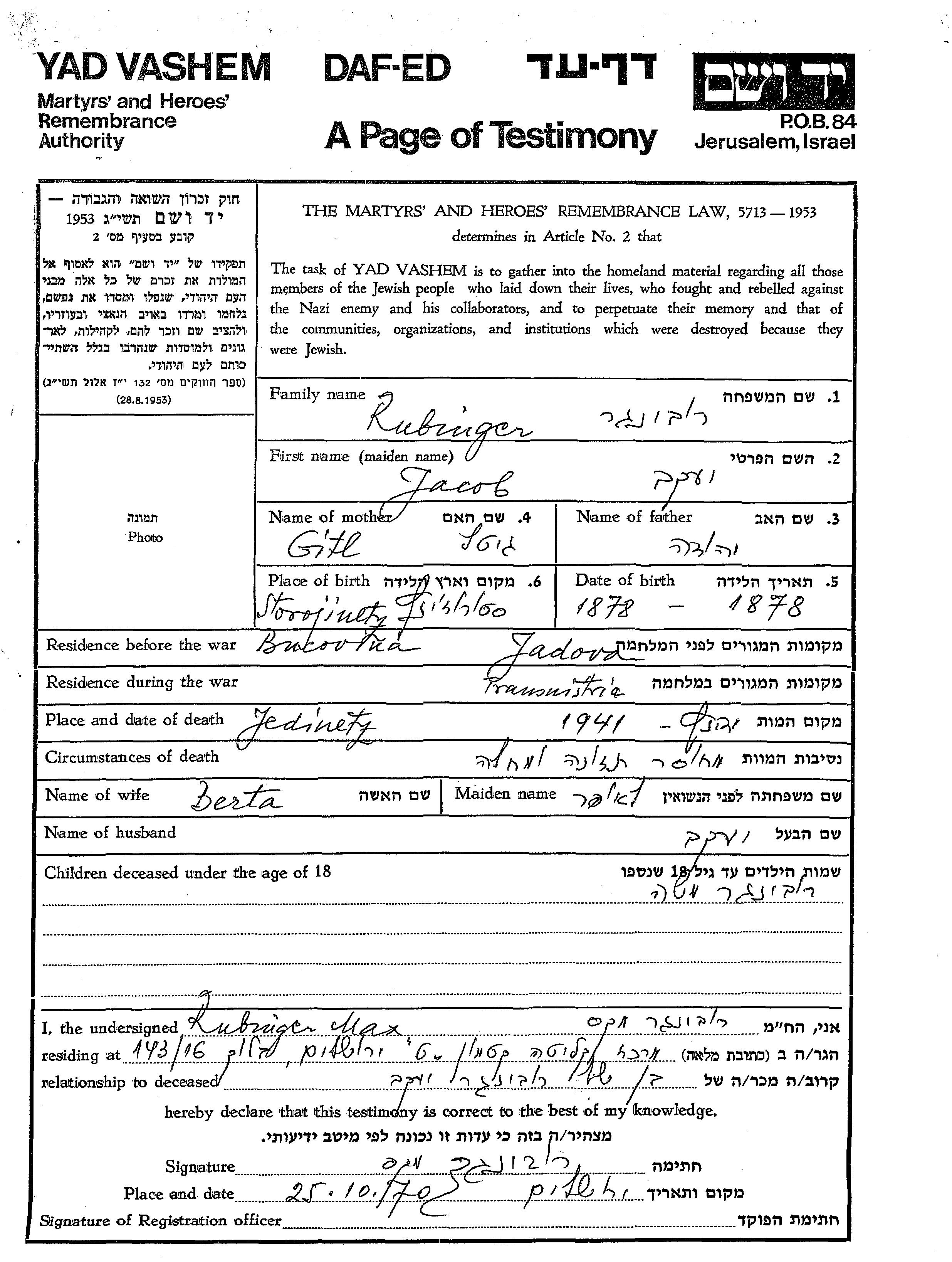Yacob Rubinger wurde im Jahr 1878 in Storojinet, Rumänien geboren. Er war der Sohn von Yehuda und Gitl. Vor dem Zweiten Weltkrieg lebte er in Jadova, Rumänien. Während des Krieges war er in Transnistria, Ukraine (UdSSR).