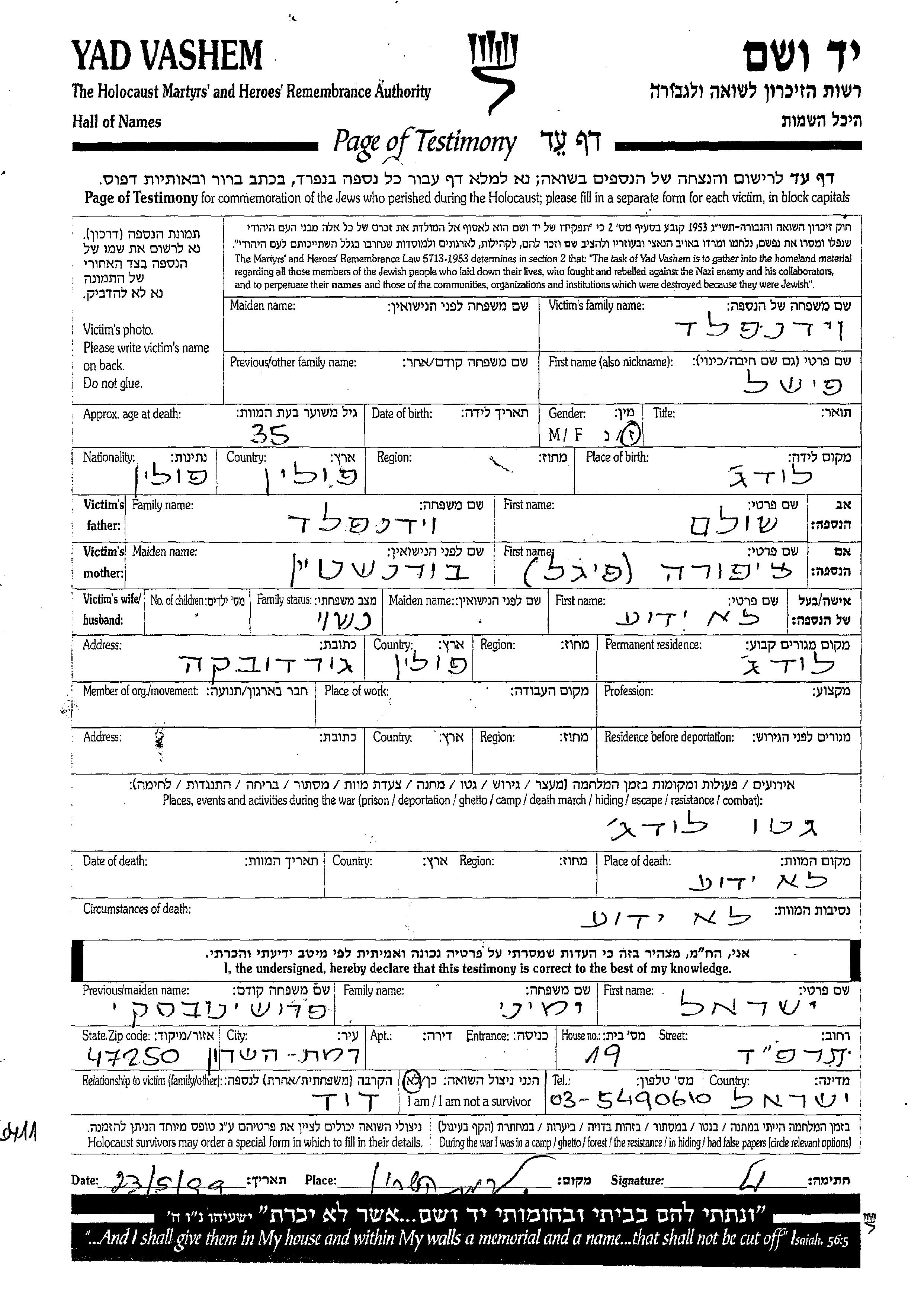 Fyszel Wajdenfeld wurde im Jahr 1903 in Lodz, Polen geboren. Er war der Sohn von Shalom und Tzipora. Er war Besitzer einer strumpffabrik und mit Hinda, geb. Popovski Verheiratet. Vor dem Zweiten Weltkrieg lebte er in Lodz, Polen. Während des Krieges war er in Lodz, Polen.