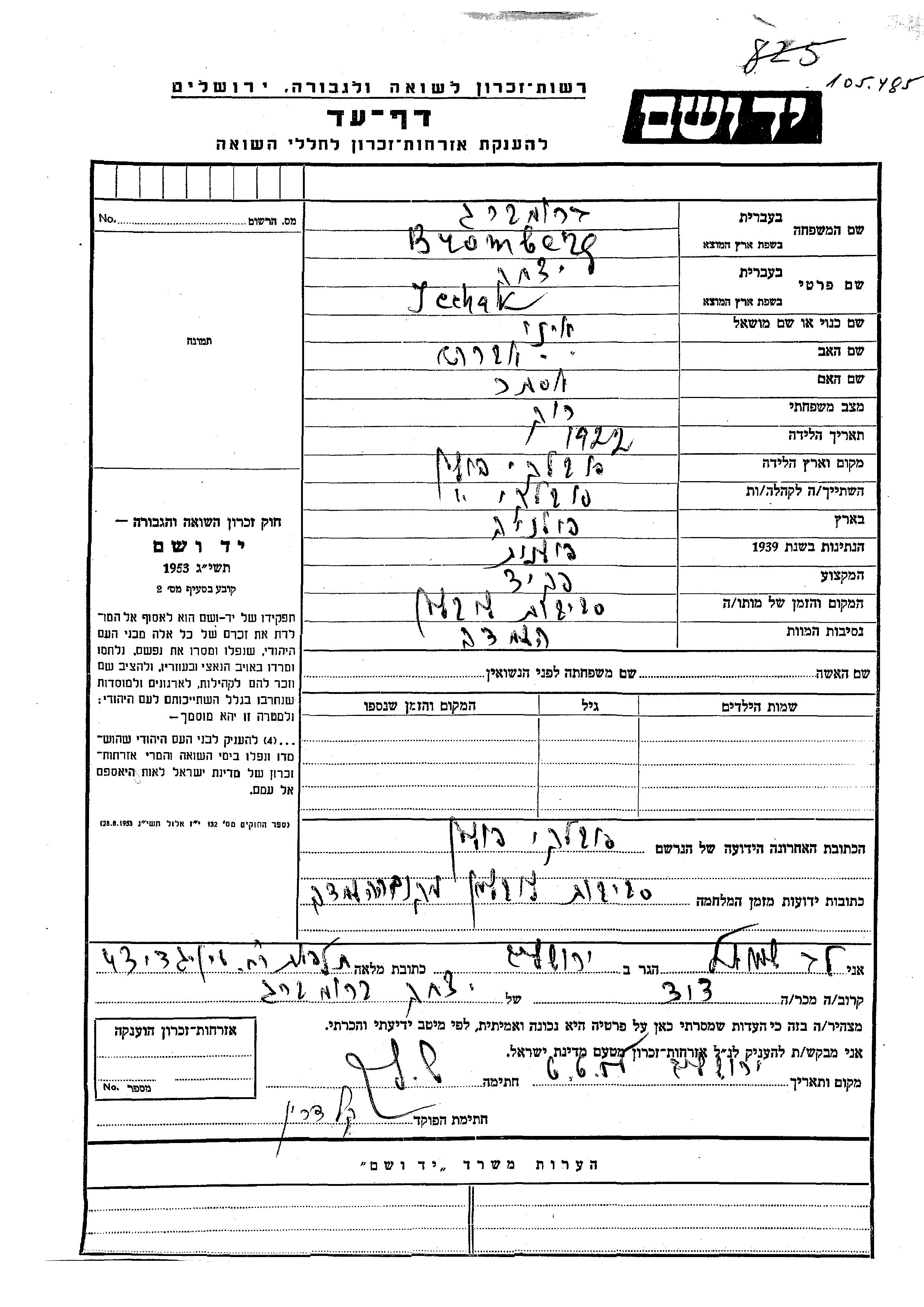 Icchak Bromberg wurde im Jahr 1922 in Suwalki, Polen geboren. Er war der Sohn von Avraham und Ester. Er war Angestellte/-r und Ledig. Vor dem Zweiten Weltkrieg lebte er in Polen. Während des Krieges war er in Lublin, Polen.