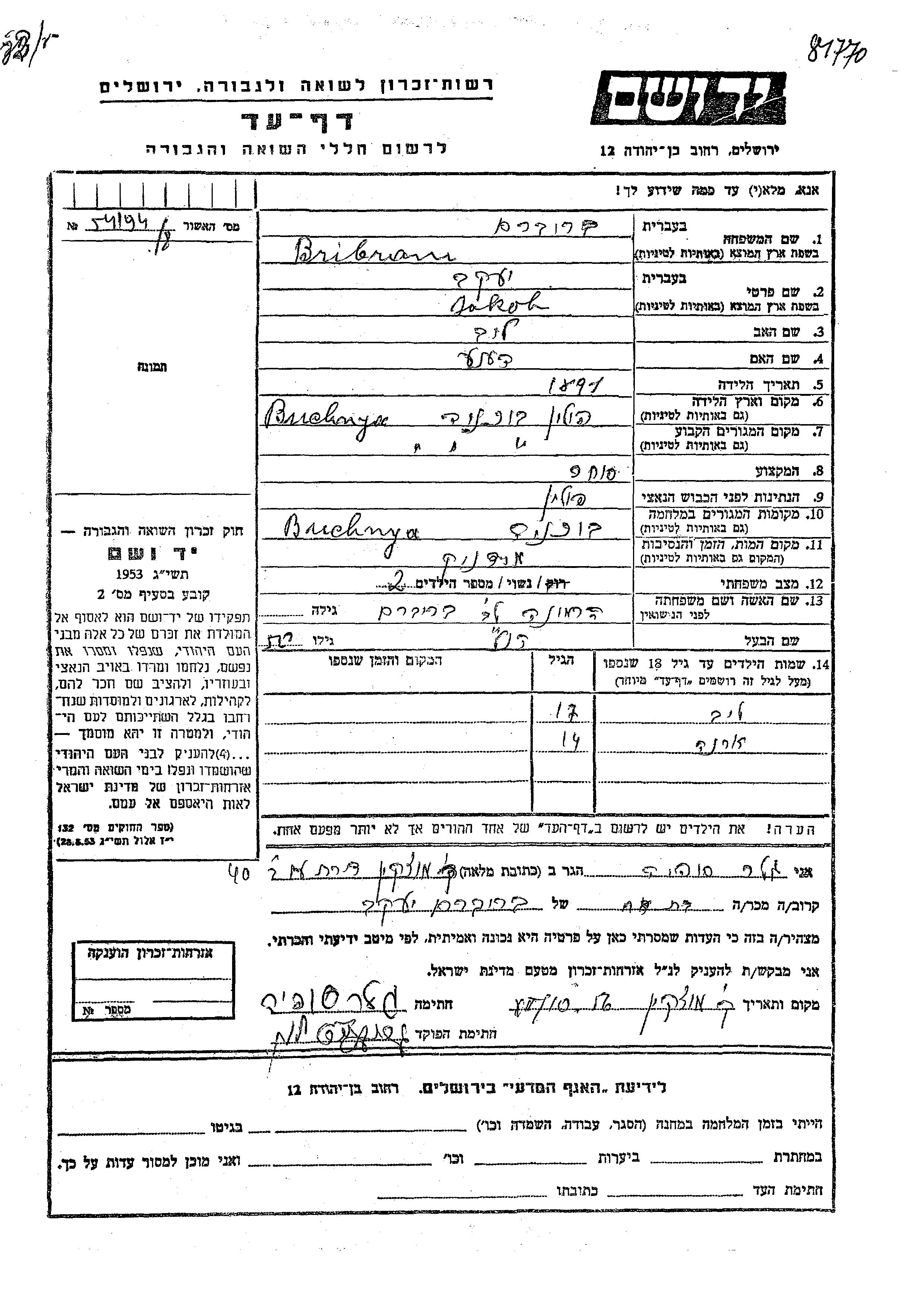 Jakow Bribram wurde im Jahr 1891 in Bochnia, Polen geboren. Er war der Sohn von Leib und Dene. Er war Kaufmann/-frau und mit Hermina Verheiratet. Vor dem Zweiten Weltkrieg lebte er in Bochnia, Polen. Während des Krieges war er in Bochnia, Polen.