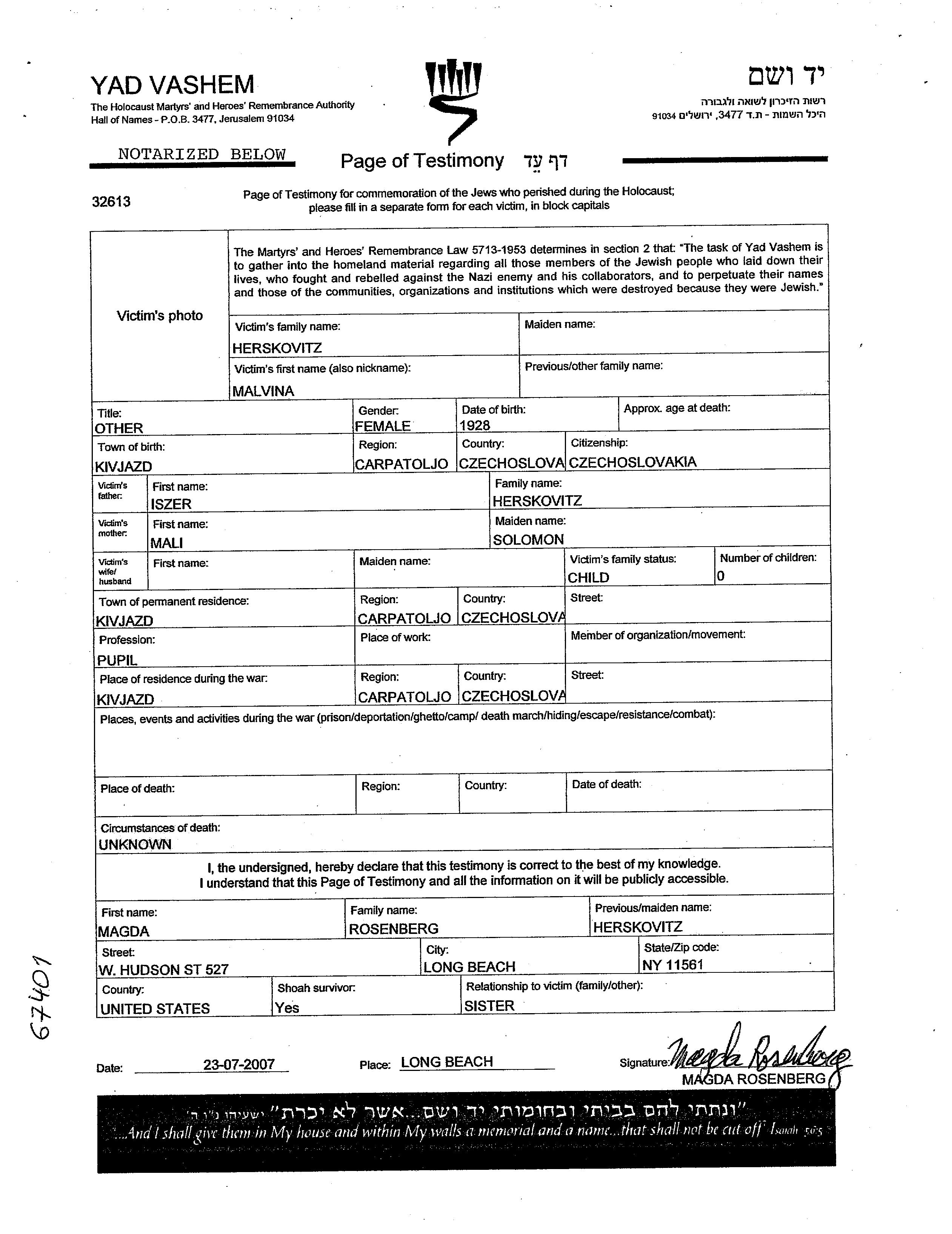 Herskovitz Malvina 1928 Kivjazd, Tschechoslowakei Gedenkblatt (digital, unterzeichnet)
