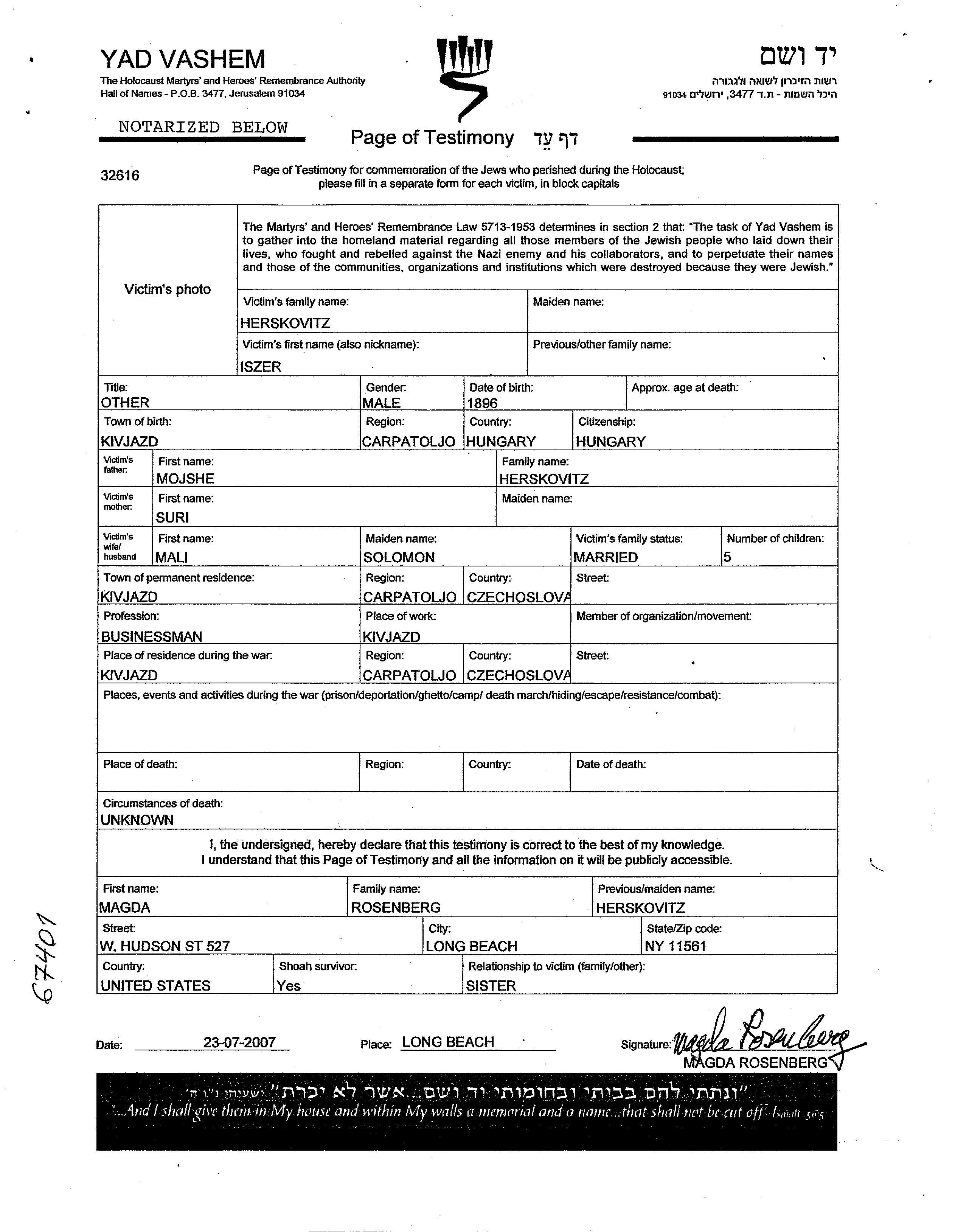 Iszer Herskovitz wurde im Jahr 1896 in Kivjazd, Tschechoslowakei geboren. Er war der Sohn von Mojshe und Suri. Er war Geschäftsmann und mit Mali, geb. Solomon Verheiratet. Vor dem Zweiten Weltkrieg lebte er in Kivjazd, Tschechoslowakei. Während des Krieges war er in Kivjazd, Tschechoslowakei.