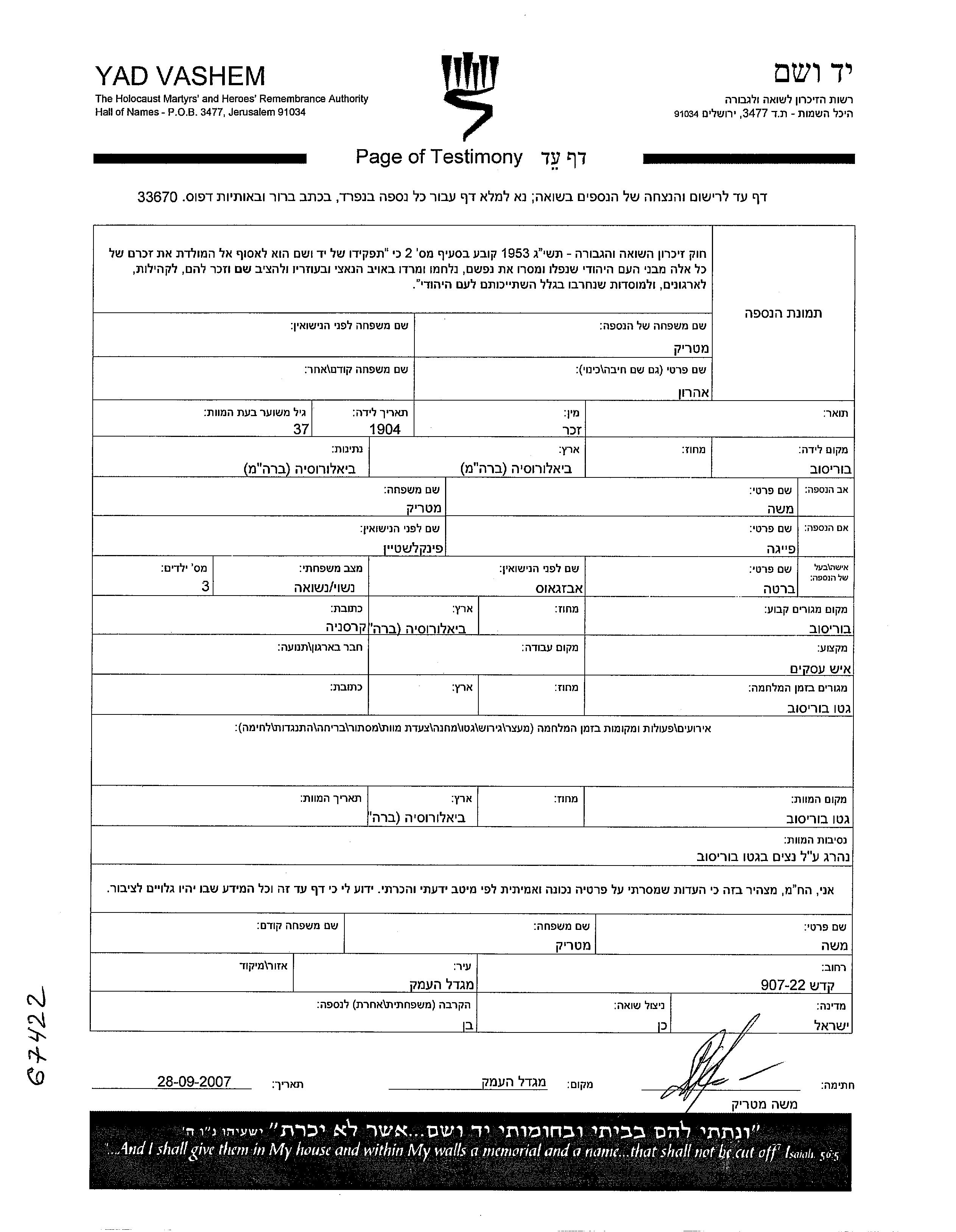 Aharon Metrik wurde im Jahr 1904 in Borisov, Weißrussland (UdSSR) geboren. Er war der Sohn von Moshe und Feiga, geb. Finkelshtein. Er war Geschäftsmann und mit Berta, geb. אבזגאוס Verheiratet. Vor dem Zweiten Weltkrieg lebte er in Borisov, Weißrussland (UdSSR). Während des Krieges war er in Borisov, Weißrussland (UdSSR).