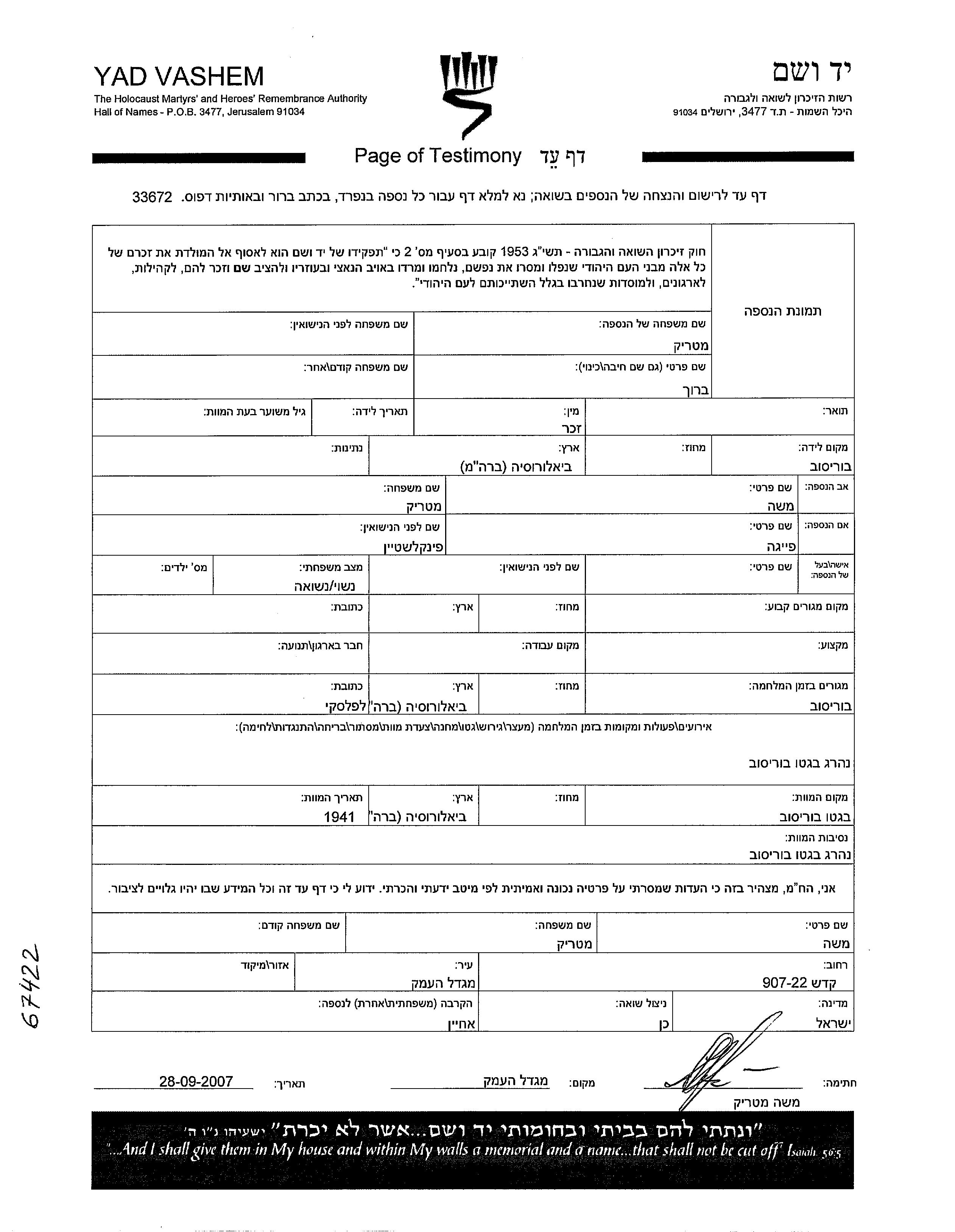Baruch Metrik wurde in Borisov, Weißrussland (UdSSR) geboren. Er war der Sohn von Moshe und Feiga, geb. Finkelshtein. Er war Verheiratet. Während des Krieges war er in Borisov, Weißrussland (UdSSR).