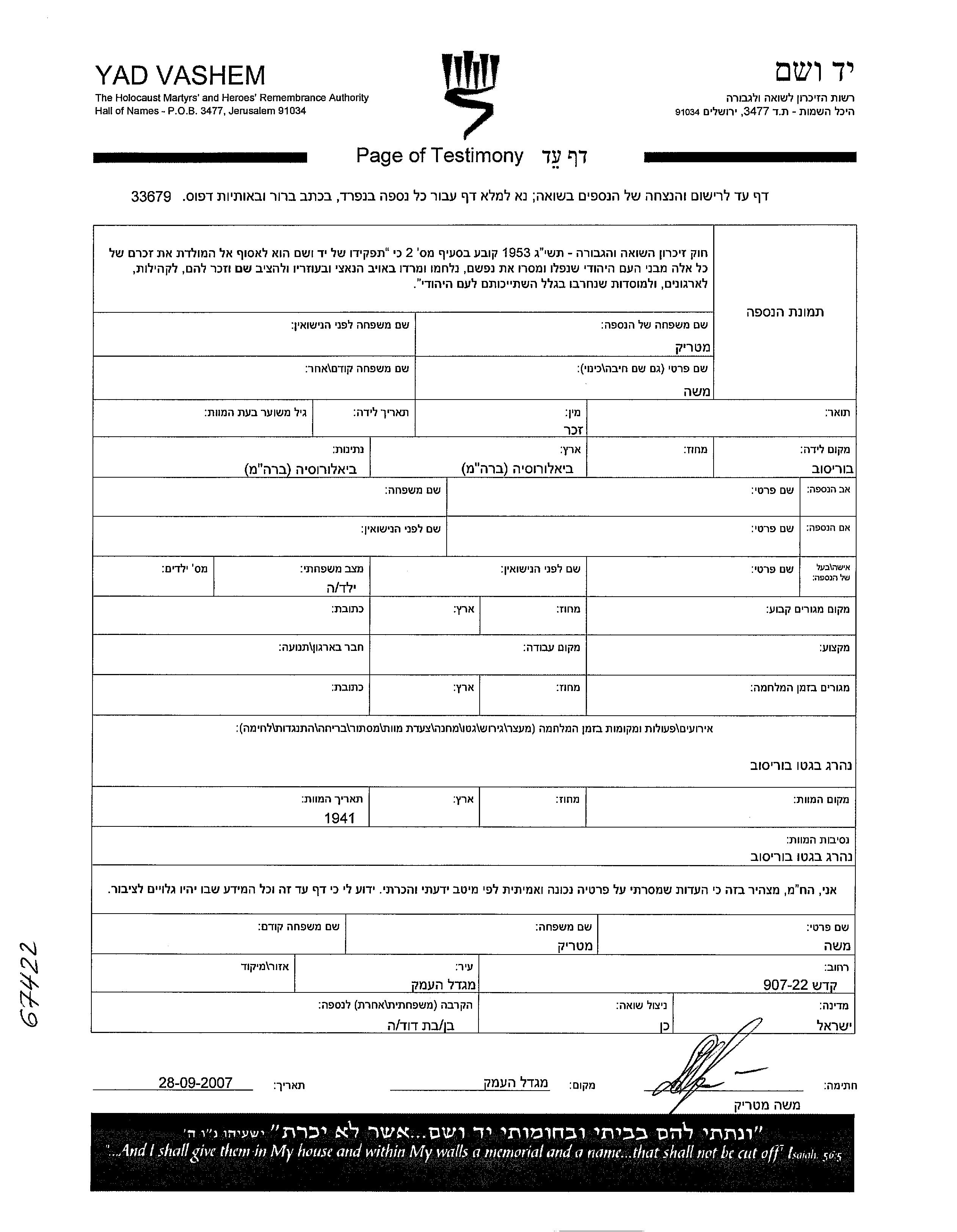 Moshe wurde in der Schoah ermordet. Todesort: Borisov, Weißrussland (UdSSR) im Jahr 1941.