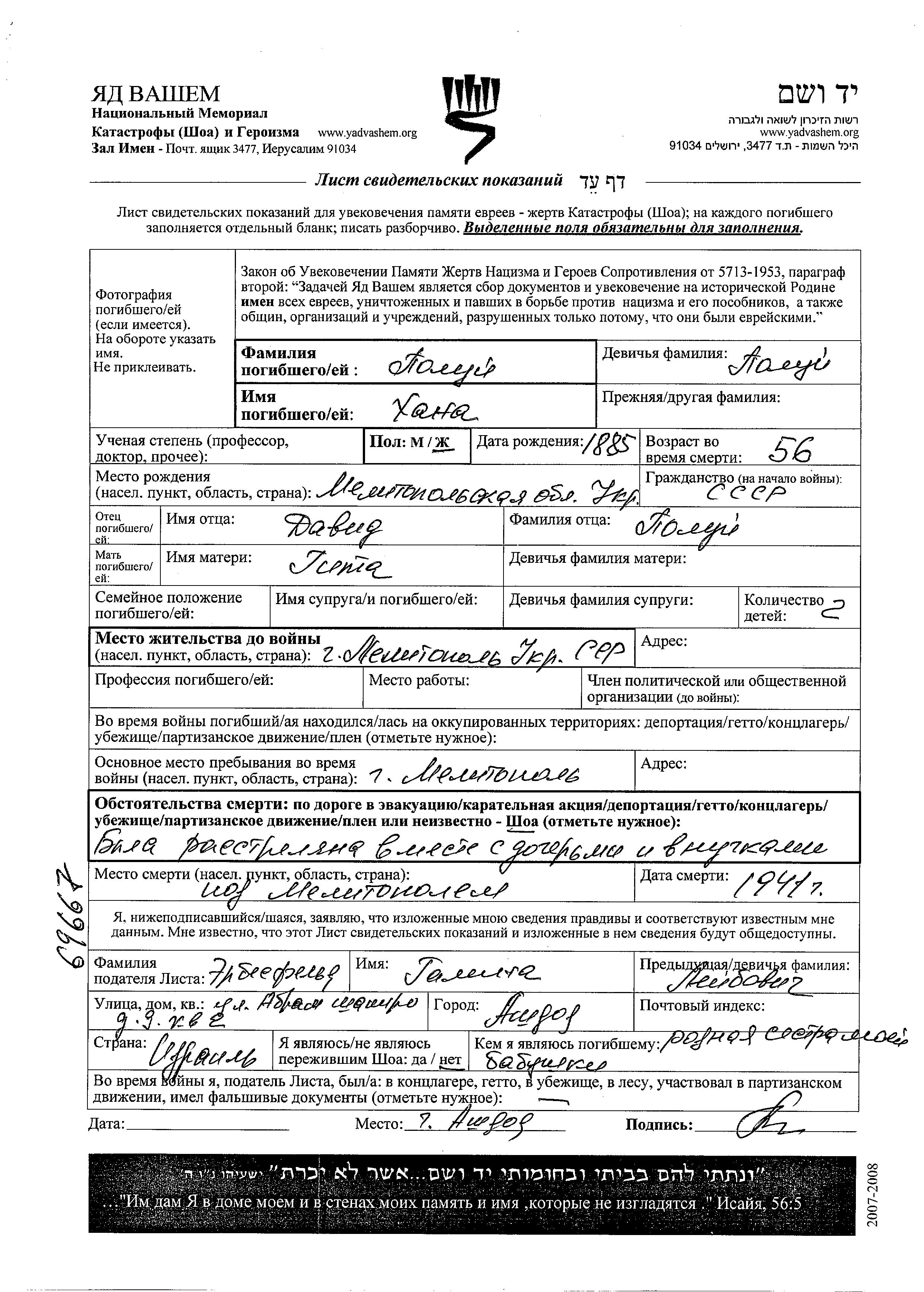 Khana Polui wurde im Jahr 1885 in Zaporozhye, Ukraine (UdSSR) geboren. Sie war die Tochter von David und Gita. Sie war Verheiratet. Vor dem Zweiten Weltkrieg lebte sie in Melitopol, Ukraine (UdSSR). Während des Krieges war sie in Melitopol, Ukraine (UdSSR).