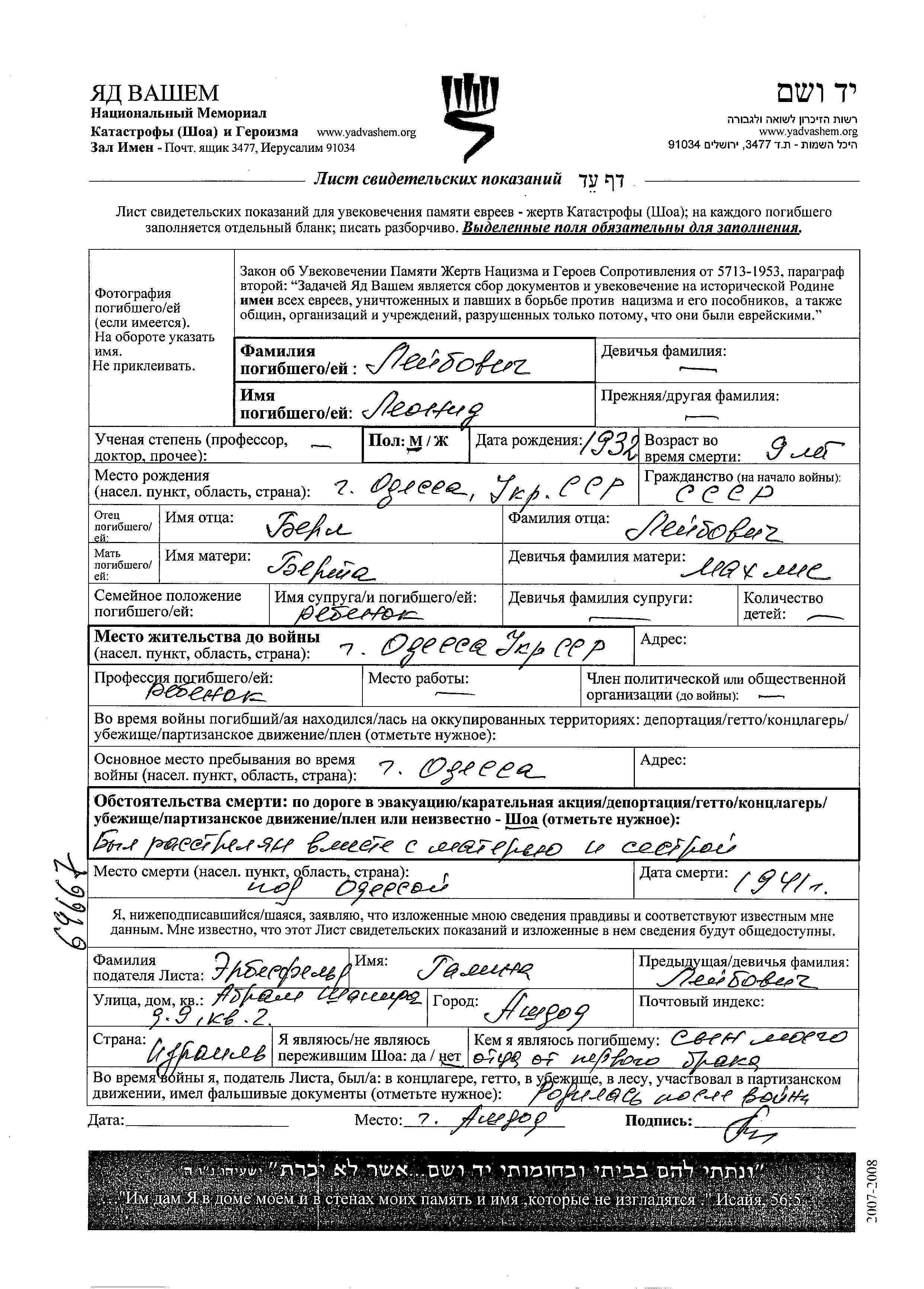 Leonid Leibovich wurde im Jahr 1932 in Odessa, Ukraine (UdSSR) geboren. Er war der Sohn von Berl und Berta, geb. Makhlis. Er war Kind. Vor dem Zweiten Weltkrieg lebte er in Odessa, Ukraine (UdSSR). Während des Krieges war er in Odessa, Ukraine (UdSSR).