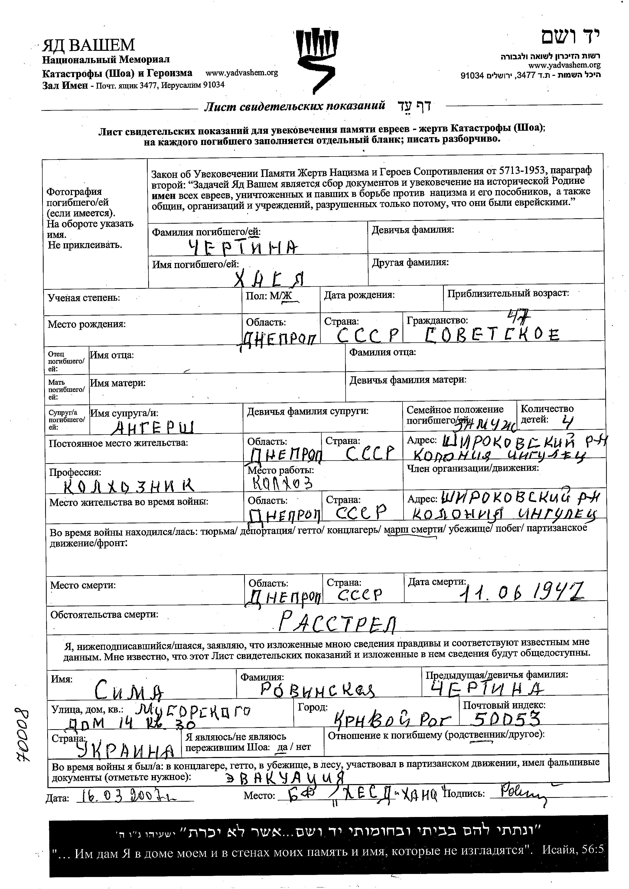 Khasya wurde in der Schoah ermordet. Todesort: Dnepropetrovsk, Ukraine (UdSSR) im Jahr 11/06/1942.