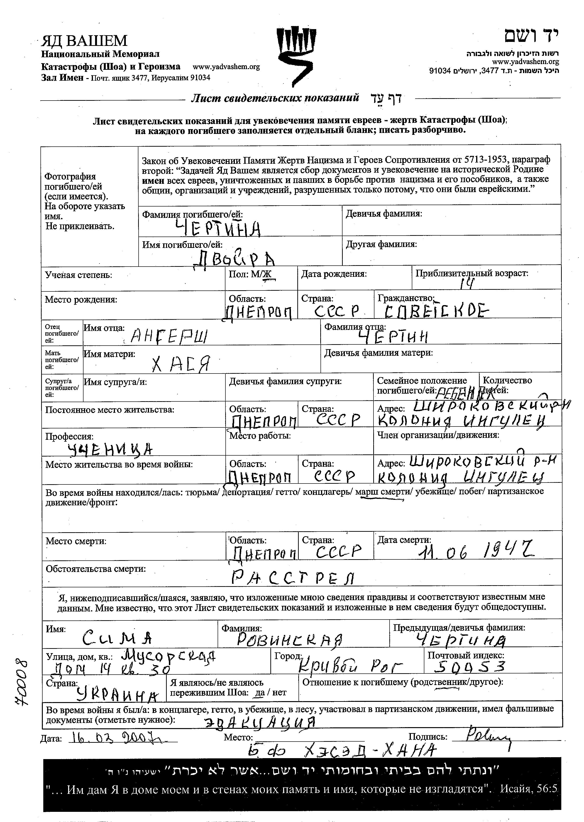 Dvoira wurde in der Schoah ermordet. Todesort: Dnepropetrovsk, Ukraine (UdSSR) im Jahr 11/06/1942.
