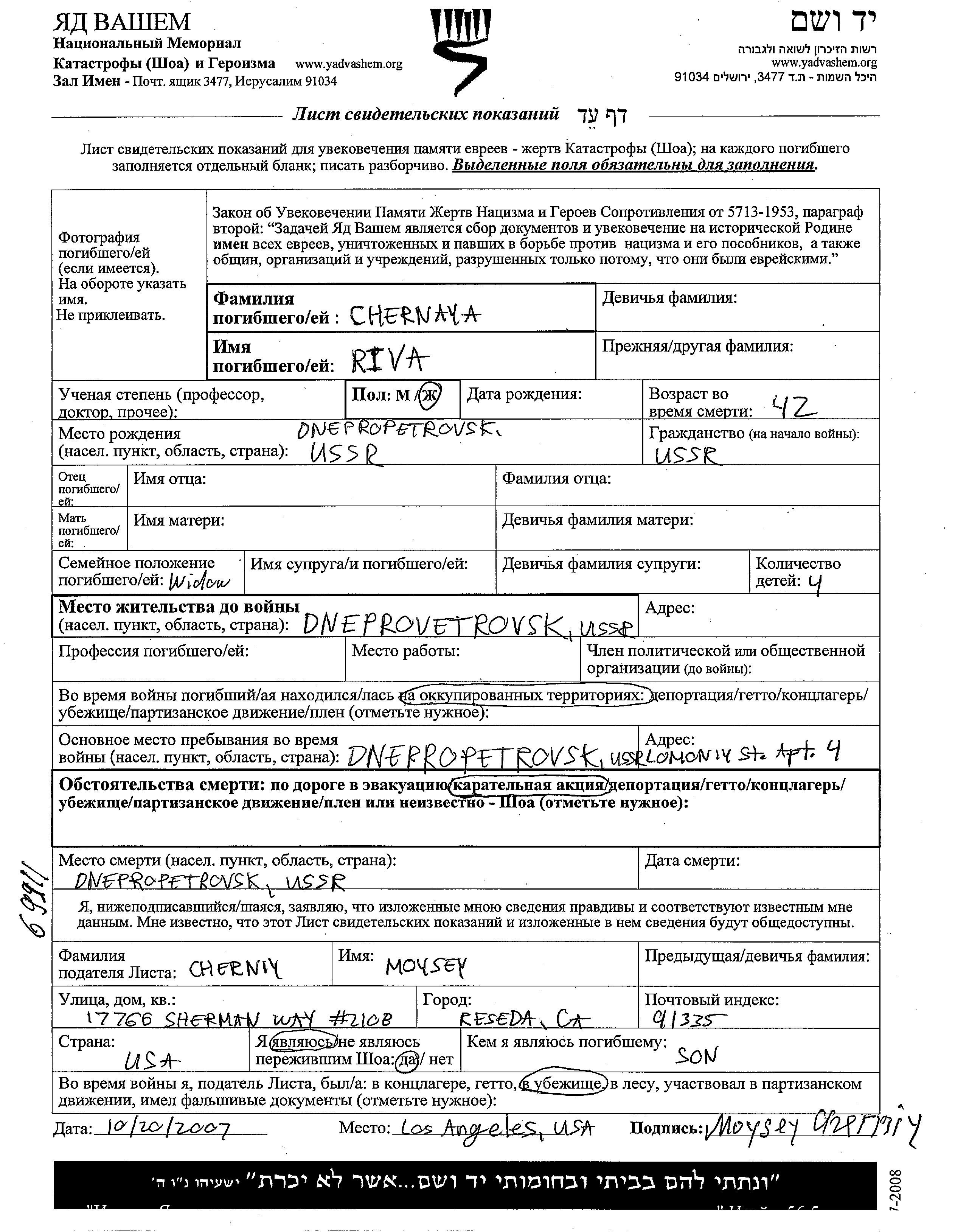 Riva Chernaya wurde in Dnepropetrovsk, Ukraine (UdSSR) geboren. Sie war Verheiratet. Vor dem Zweiten Weltkrieg lebte sie in Dnepropetrovsk, Ukraine (UdSSR). Während des Krieges war sie in Dnepropetrovsk, Ukraine (UdSSR).