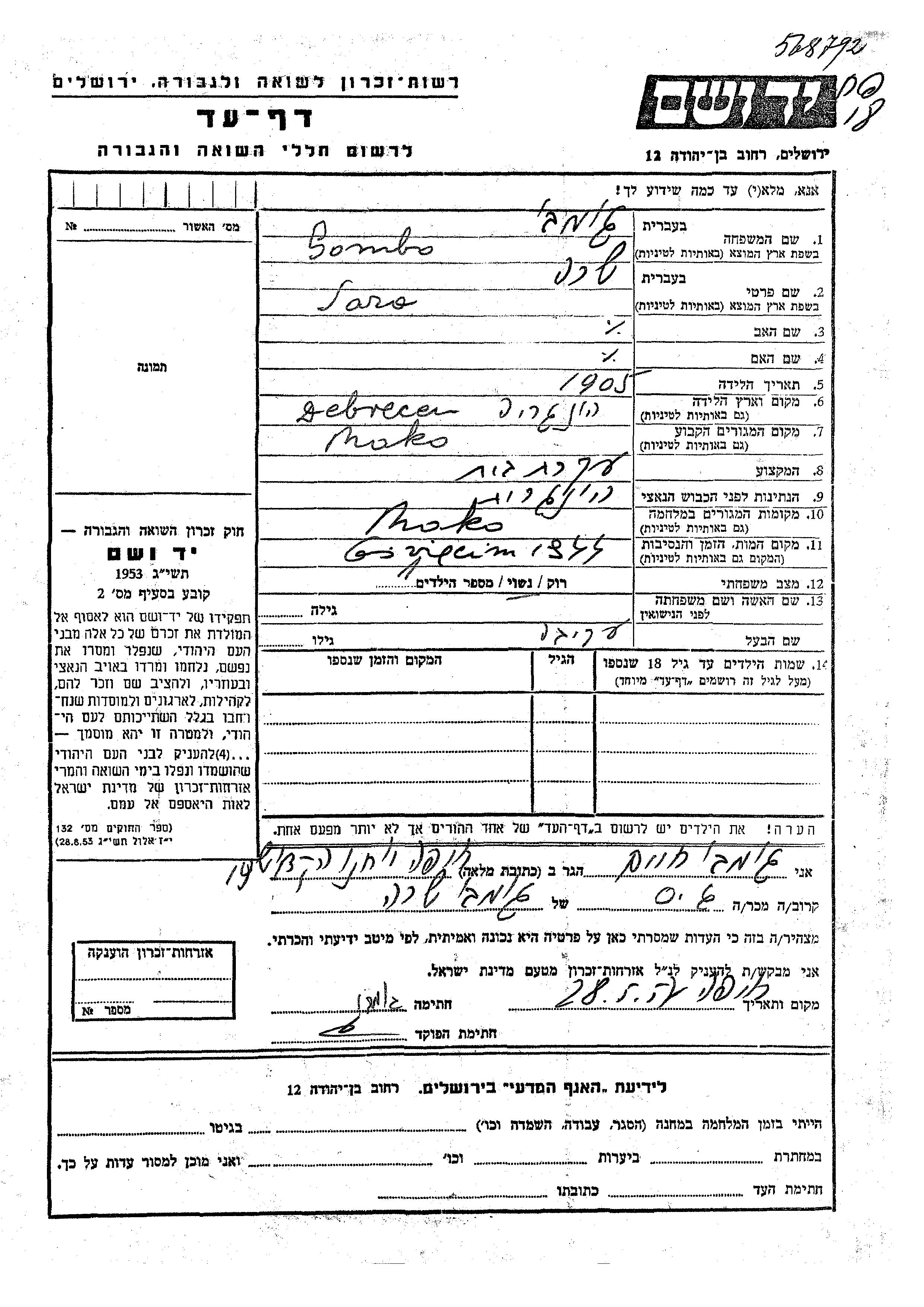 Sara Gombo wurde im Jahr 1905 in Debrecen, Ungarn geboren. Sie war Hausfrau und mit Akiva Verheiratet. Vor dem Zweiten Weltkrieg lebte sie in Moko, Ungarn. Während des Krieges war sie in Moko, Ungarn.