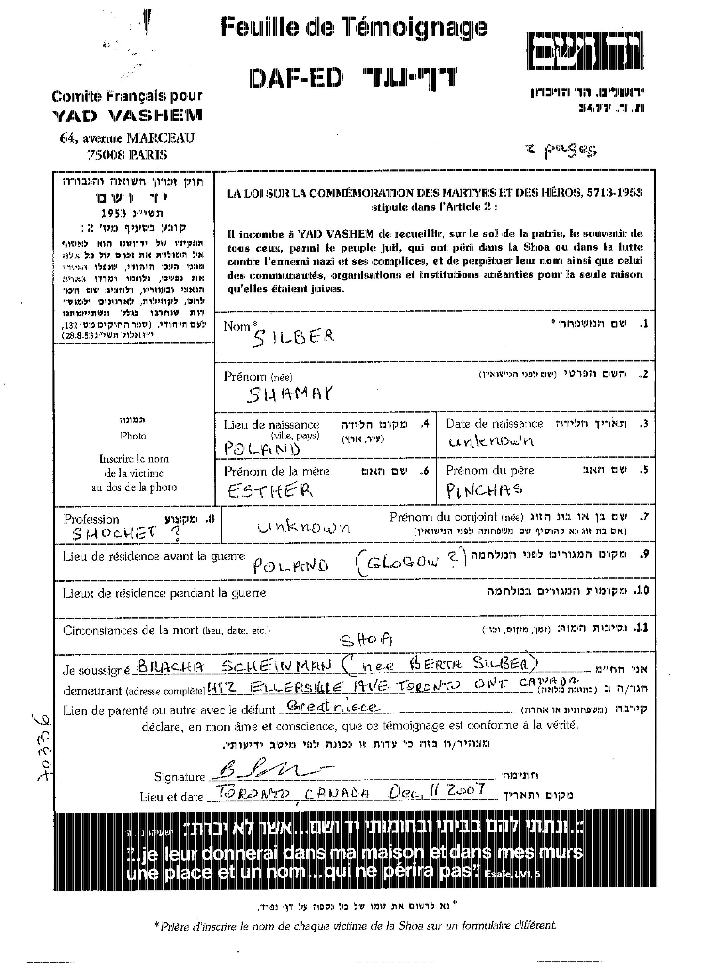 Shamay Silber wurde in Polen geboren. Er war der Sohn von Pinchas und Esther. Vor dem Zweiten Weltkrieg lebte er in Glogow, Polen.