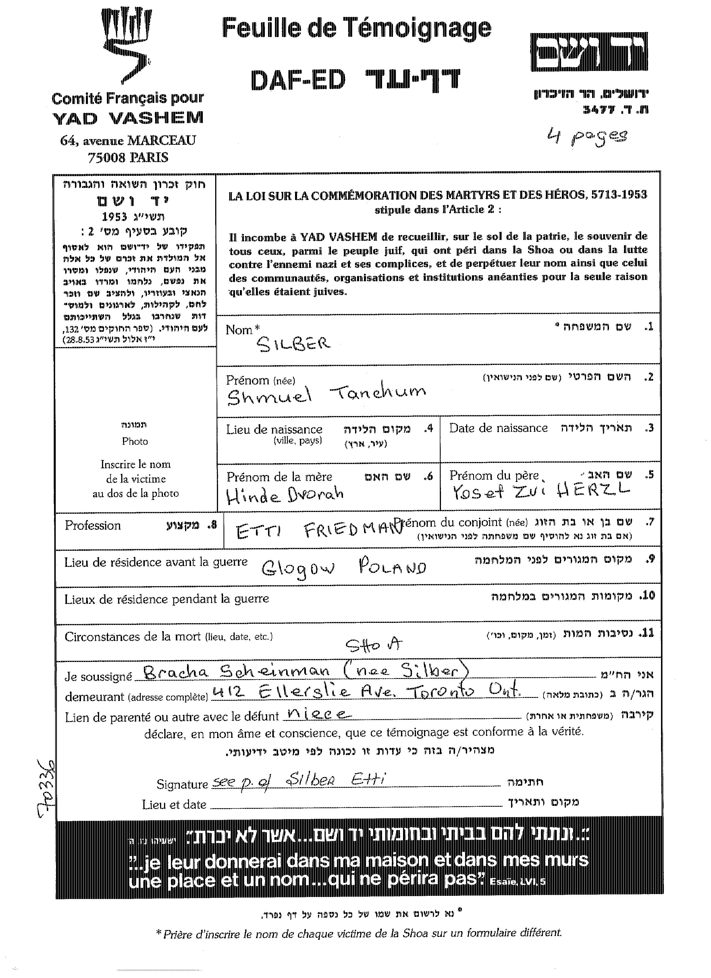 Shmuel Tanchum Silber wurde Er war der Sohn von Yosef Zvi Herzl und Hinde Dvorah. Er war mit Etti, geb. Friedman Verheiratet. Vor dem Zweiten Weltkrieg lebte er in Glogow, Polen.