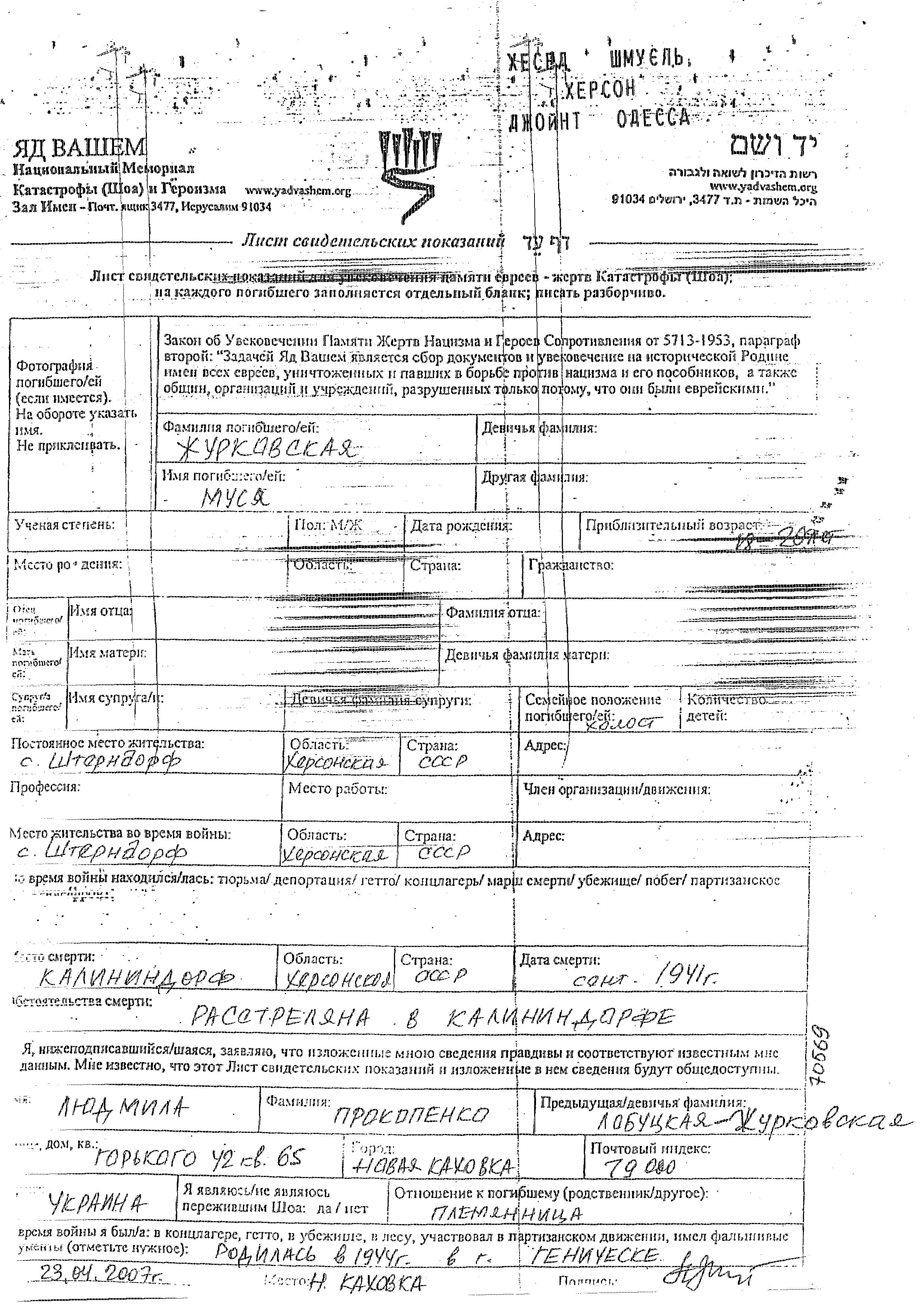 Musya Zhurkovskaya. Sie war Ledig. Vor dem Zweiten Weltkrieg lebte sie in Shterndorf, Ukraine (UdSSR). Während des Krieges war sie in Shterndorf, Ukraine (UdSSR).
