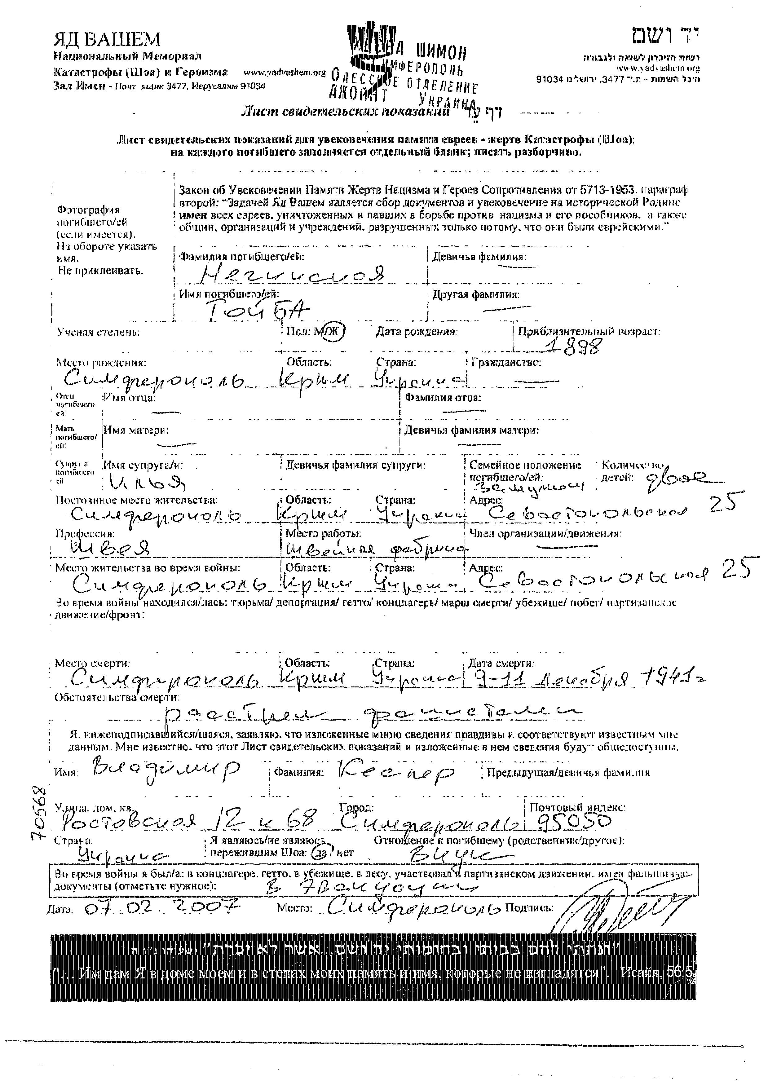 Toiba Neginskaya wurde im Jahr 1898 in Simferopol, Russland (UdSSR) geboren. Sie war Shveya russian und mit Iliya Verheiratet. Vor dem Zweiten Weltkrieg lebte sie in Simferopol, Russland (UdSSR). Während des Krieges war sie in Simferopol, Russland (UdSSR).
